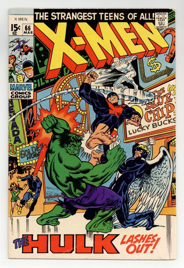 $120.00Cover pencils by Marie Severin, inks by Sam Grainger. The Mutants and the Monster, script by Roy Thomas, pencils by Sal Buscema, inks by Sam Grainger; With Professor X in a coma after warding off the Z'Nox, the X-Men try to reach him and he mentally tells them one word, "Hulk"; The X-Men track down the jade giant and Jean's mental powers cause him to revert to Bruce Banner; Banner tells them that he has a machine that may save Xavier but Major Talbot shows up and causes him to transform to the Hulk again; The X-Men follow him into the desert and battle him at the site of an old lab where they are able to procure the piece of machinery that brings Professor X out of his coma; "And they fought happily ever after...??" Statement of ownership--average print run 405,115; average paid circulation 235,811. 36 pgs. $0.15. Cover price $0.15.