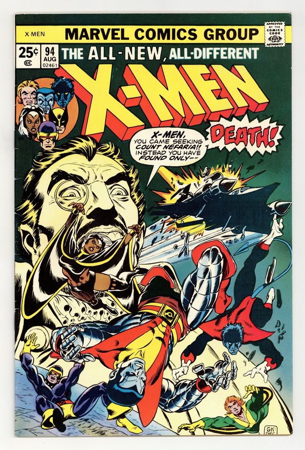 "The Doomsmith Scenario!" Part 1 of 2. Story by Chris Claremont and Len Wein. Art by Dave Cockrum. It is a changing of the guard at Xavier's School for the Gifted. Professor X's original students are replaced by an all new team of X-Men. The demonic acrobat Nightcrawler, the weather controlling Storm, the iron-skinned strongman - Colossus, the shrieking Banshee, the tribal warrior - Thunderbird, and the dangerous Wolverine have been gathered together from the four corners of the world to defend mankind from the forces of evil, and to vanguard Xavier's dream of mutants and humans co-existing in peace and harmony. However, their first mission may be their last. The new X-Men must stop the sinister madman Count Nefaria who has seized control of the United States' strategic missile force. 36 pgs. Cover price $0.25.