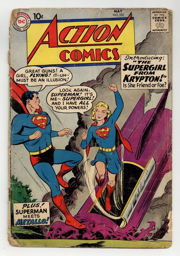 Cover pencils by Curt Swan, inks by Al Plastino. Origin and 1st appearance of Supergirl in "The Supergirl from Krypton!", script by Otto Binder, art by Al Plastino; Superman spies a crashing rocket and discovers his cousin Supergirl; She tells him how Argo City survived the destruction of Krypton and how her father sent her to Earth when the inhabitants of Argo City were threatened by Kryptonite poisoning; Superman sets her up in Midvale Orphanage so she can adjust to life on Earth. Intro new Metallo "The Menace of Metallo!", script by Robert Bernstein, art by Al Plastino; Criminal John Corben, who is nearly killed in an auto accident, is given a robot body powered by uranium; When he is hit by bullets meant for Lois, she assumes he is really Superman. 2/3-page Little Pete story by Henry Boltinoff. "Congo Bill Dies at Dawn!", script by Robert Bernstein, art by Howard Sherman. 36 Pages, Full Color. $.10 Cover price $0.10.