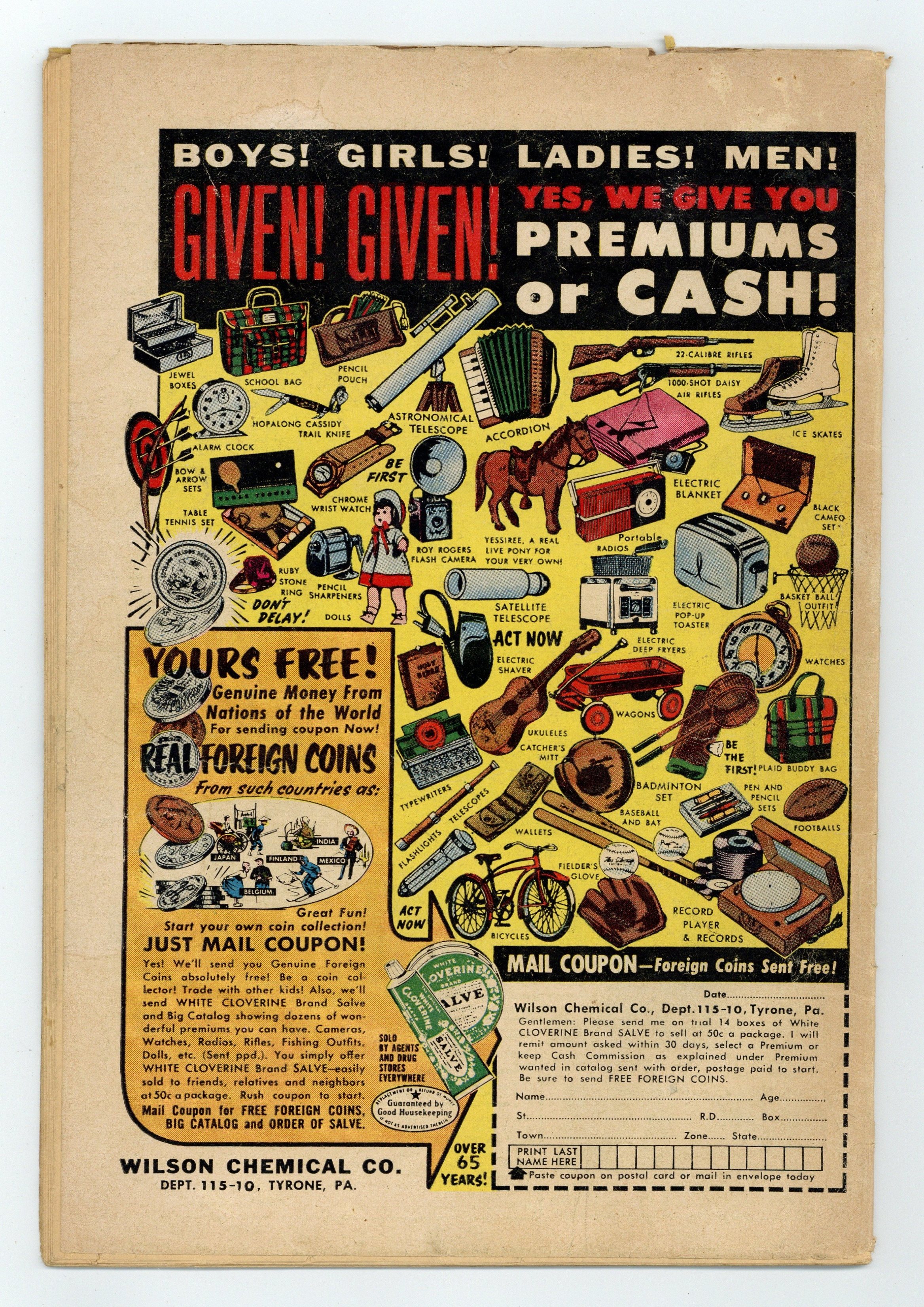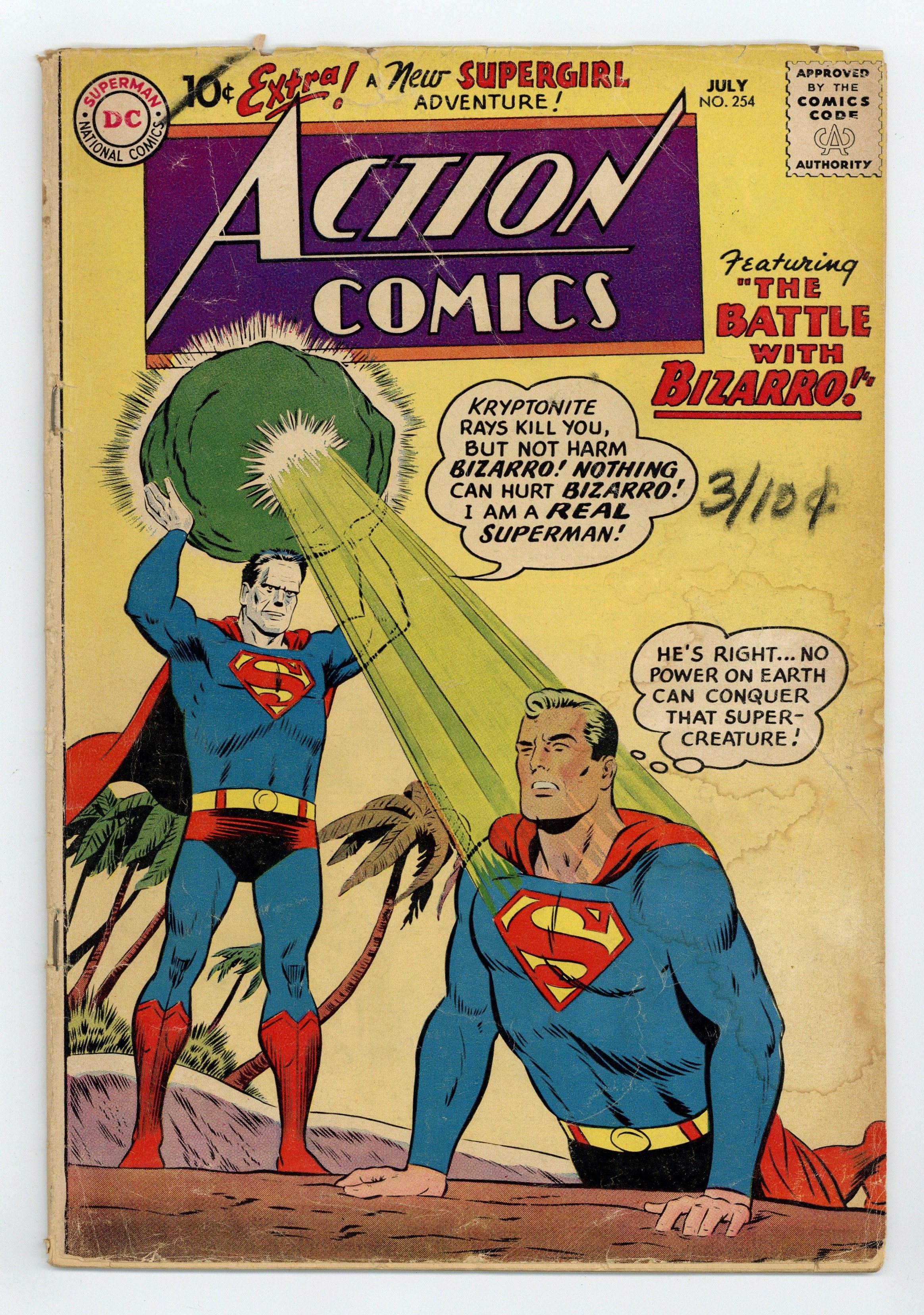 Cover pencils by Curt Swan, inks by Stan Kaye. 1st meeting of Bizarro and Superman (cover & story) in "The Battle with Bizarro!", script by Otto Binder, art by Al Plastino; Luthor steals Professor Dalton's duplicating machine and creates an adult Bizarro to menace Superman, but this Bizarro turns on its creator, hands him over to the authorities, and attempts to help Superman; When the people he has helped react in horror to him, Bizarro gets depressed. 2/3-page Ollie story by Henry Boltinoff. "Congorilla Goes Wild!", art by Howard Sherman; A thief steals Congo Bill's ring and uses it to switch minds with Congorilla. "Supergirl's Foster Parents!", script by Otto Binder, art by Jim Mooney; Supergirl is adopted by a couple that turn out to be snake-oil salesmen. 36 Pages, Full Color. $.10 Cover price $0.10.