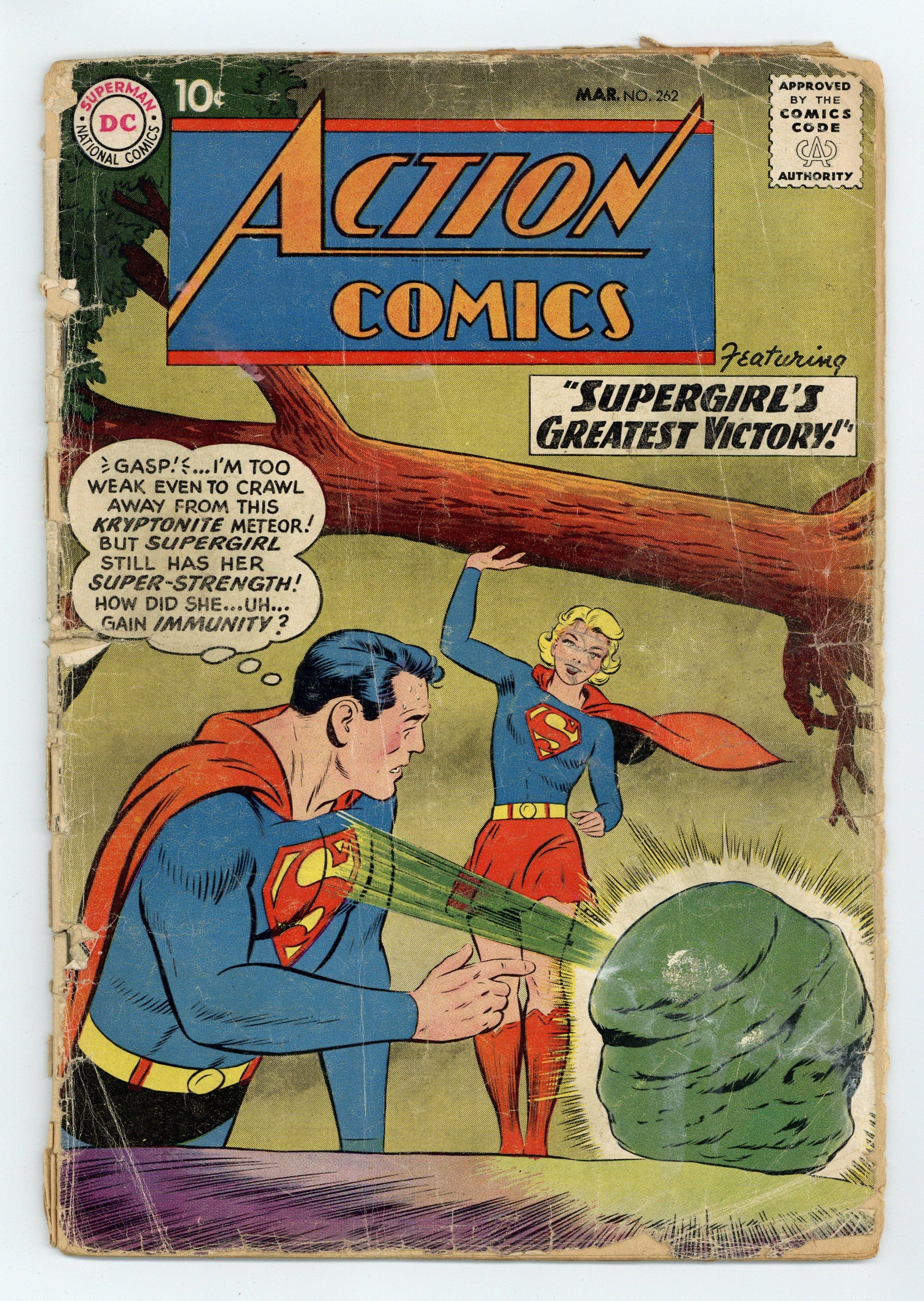 Cover pencils by Curt Swan, inks by Stan Kaye. "When Superman Lost His Powers!", script by Robert Bernstein, pencils by Wayne Boring, inks by Stan Kaye; While in the Mexican jungle reporting on an Aztec tomb, the Planet staff is magically whisked to a red sun planet where Clark has no powers; Superman has to fake super feats to reassure the Planet staff that everything is under control. 2/3-page Shorty story by Henry Boltinoff. "Supergirl's Greatest Victory!", script by Otto Binder, art by Jim Mooney; Supergirl tries to build up an immunity to Kryptonite by gradually exposing herself to larger and larger doses. 2/3-page Jerry the Jitterbug story by Henry Boltinoff. Ad for Superman's Girl Friend, Lois Lane #16, Adventure Comics #270, and Superman #136. 36 Pages, Full Color. $.10 This is the very first time that Superman's powers are linked to Earth's yellow sun. Cover price $0.10.