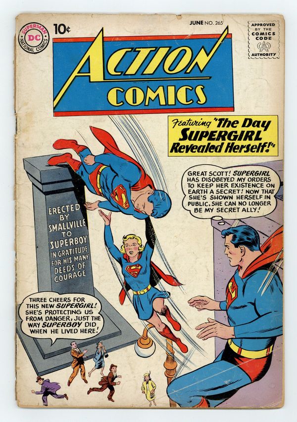 Cover pencils by Curt Swan. "The Superman from Outer Space!", script by Otto Binder, pencils by Curt Swan, inks by John Forte; Superman meets Hyper-Man from the parallel world of Oceania; When he discovers that Hyper-Man is dying, Superman arranges for his identity to be revealed so that he can spend his last year married to his girlfriend Lydia Long. -page Private Pete story by Henry Boltinoff. "The Day Supergirl Revealed Herself!", script by Jerry Siegel, art by Jim Mooney; A strange meteor gives Supergirl amnesia, so she uses her power openly in Smallville. 36 Pages, Full Color. $.10 Cover price $0.10.