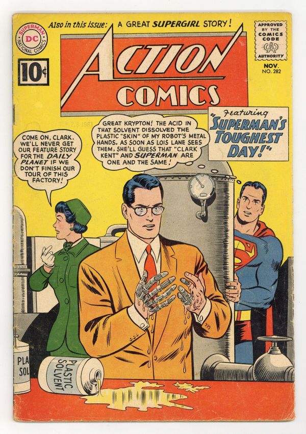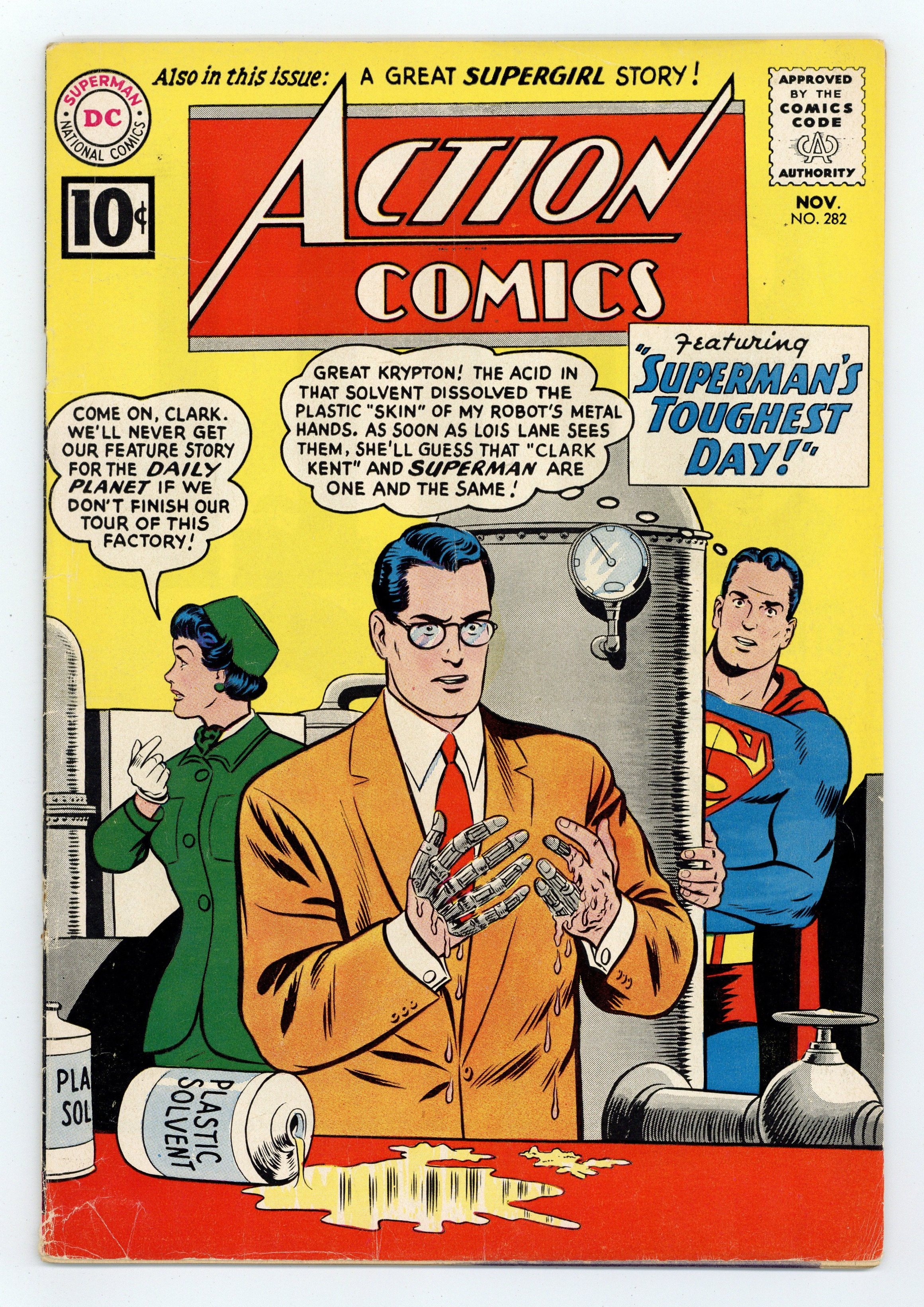 Last 10-cent cover price. Cover pencils by Curt Swan, inks by Stan Kaye. "Superman's Toughest Day!", script by Bill Finger, art by Al Plastino; A day in Superman's life. His Clark Kent robot has to avoid showing the damage to his hands while on a date with Lois. One-page Shorty story by Henry Boltinoff. One-page Sagebrush Sam story by Henry Boltinoff. "The Supergirl of Tomorrow!", script by Jerry Siegel, art by Jim Mooney; Using a time machine, a powerless Supergirl travels to the future, where her powers return and she frees humanity from the tyrannical reign of the Clan of Censors. One-page Little Pete story by Henry Boltinoff. 36 Pages, Full Color. $.10 Cover price $0.10.