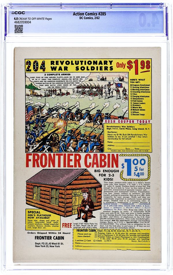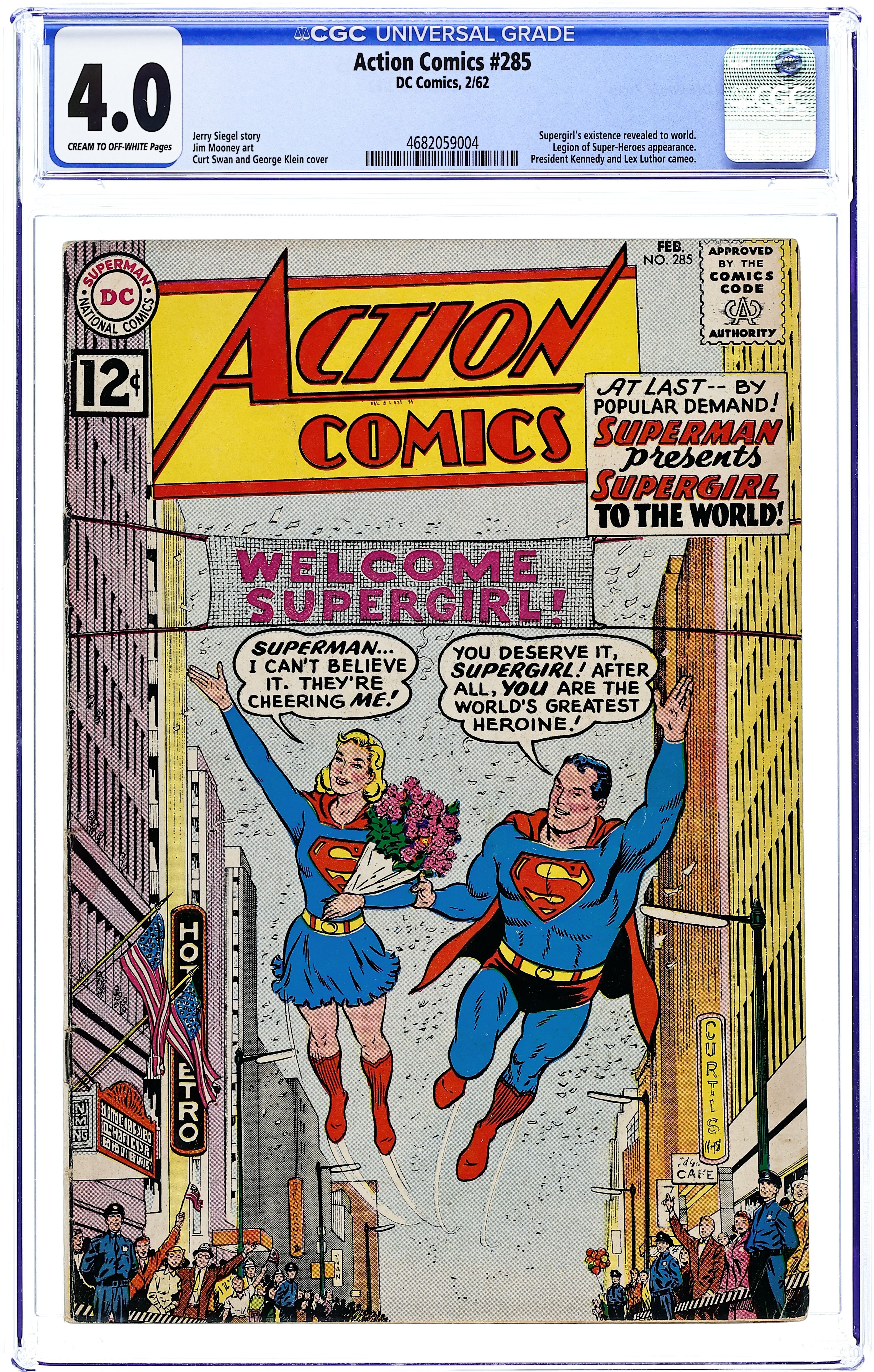 Cover pencils by Curt Swan, inks by George Klein. "The World's Greatest Heroine!, Part 1", script by Jerry Siegel, art by Jim Mooney; Superman reveals Supergirl to the world; President John F. Kennedy appearance; Jackie Kennedy cameo. One-page Little Pete story by Henry Boltinoff. "The Infinite Monster!, Part 2", script by Jerry Siegel, art by Jim Mooney; Supergirl stops a creature from another dimension in her first solo adventure after Superman revealed her to the world. 36 Pages, Full Color. $.12 Cover price $0.12.