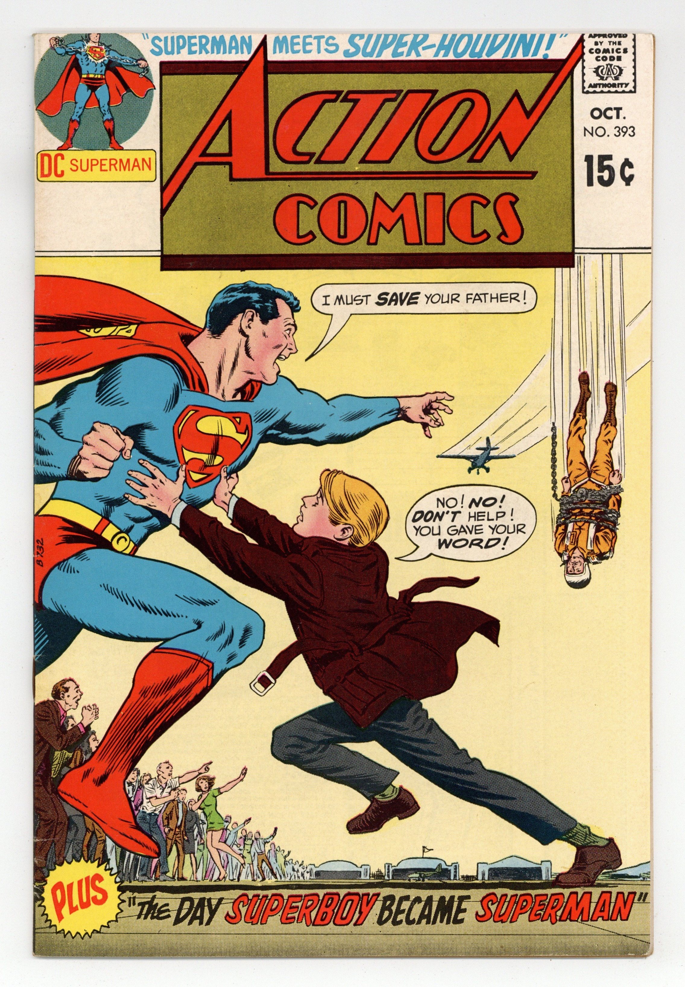 Cover pencils by Curt Swan, inks by Murphy Anderson. "Superman Meets Super-Houdini!", script by Leo Dorfman, pencils by Curt Swan, inks by Murphy Anderson; Daredevil escape artist "Hair-Breadth" Holahan must confront his secret criminal past when gangsters blackmail him into helping them. Superman Scrapbook: Various "action shots" of Superman from the early years. "The Day Superboy Became Superman!", script by Leo Dorfman (as Geoff Brown), pencils by Ross Andru, inks by Mike Esposito; Superboy encounters student activist Marla Harvey, who challenges his beliefs and assumptions; When she dies in an accident while helping others, he resolves to dedicate himself to her principles. It's the Scene humor page by Henry Boltinoff. Letters to the editor from Irene Vartanoff, Richard Morrissey, and cartoonist Jay Zilber. 36 Pages, Full Color. $0.15 Cover price $0.15.