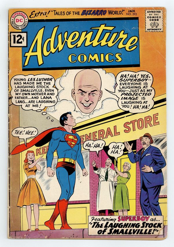 Cover pencils by Curt Swan. The Laughing Stock of Smallville, script by Bill Finger, art by Al Plastino; Luthor pulls a series of stunts designed to make Superboy look ridiculous. Origin explains how Luthor lost his hair and began to hate Superboy. Professor Eureka humor page by Henry Boltinoff. Bizarro Creates a Monster--Tales of the Bizarro World, script by Jerry Siegel, art by John Forte; Handsome Bizarro movie hero viewed as monster. Ollie humor page by Henry Boltinoff. 36 pages, Full Color. Cover price $0.12.