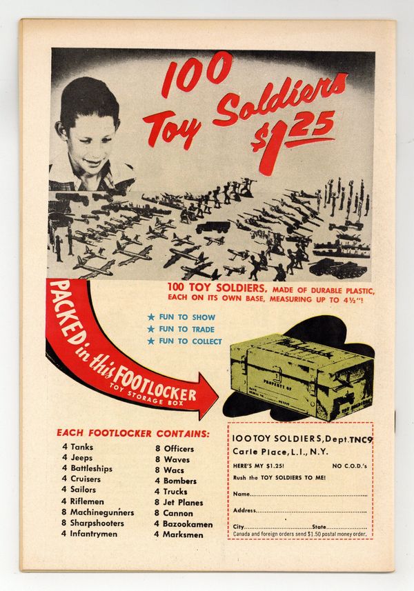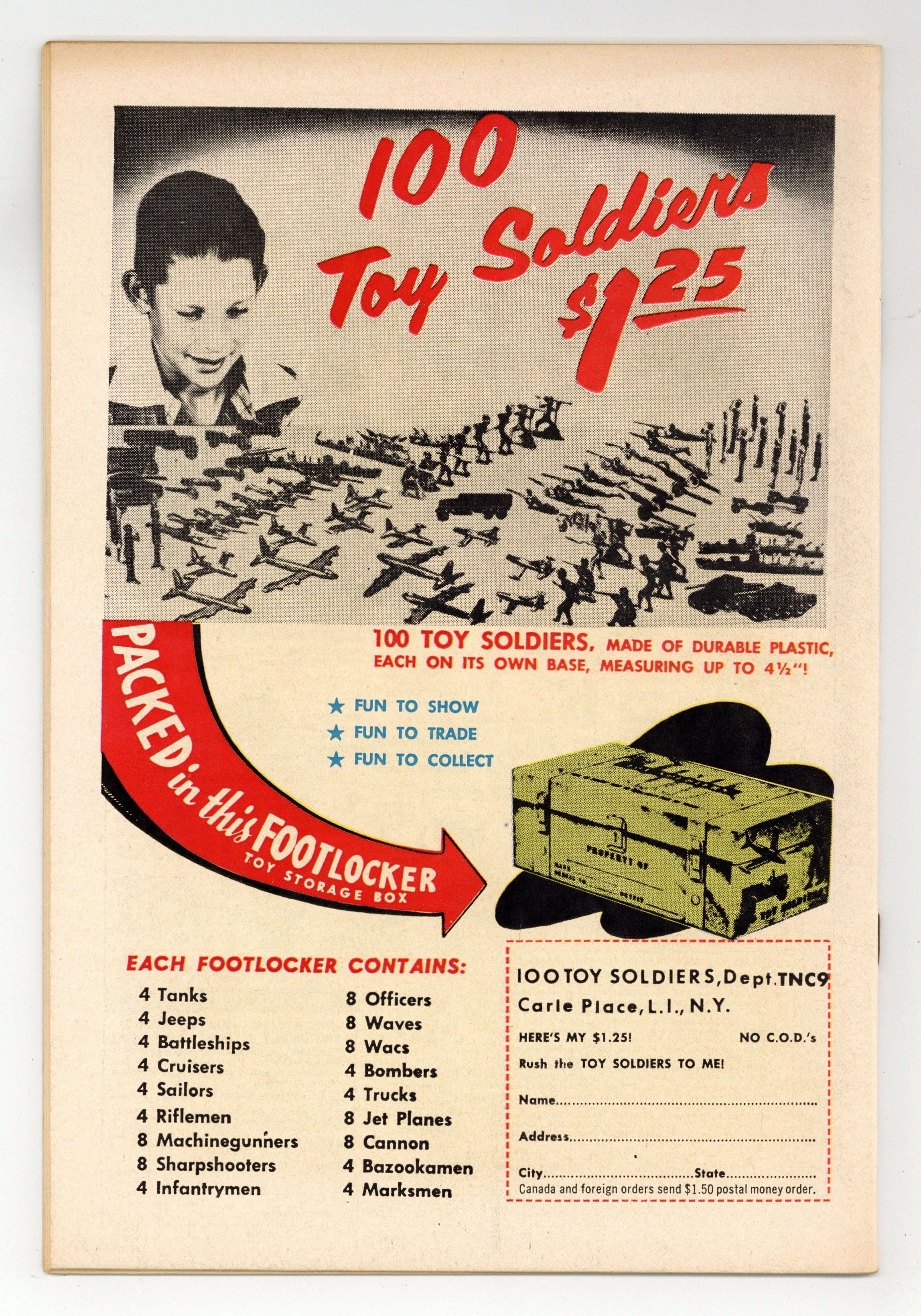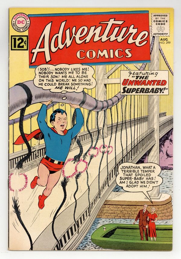 Cover pencils by Curt Swan, inks by George Klein. 1st appearance of gold Kryptonite in the Superboy imaginary story The Unwanted Superbaby, script by Jerry Siegel, art by George Papp; After his powers are revealed, the military takes custody of baby Kal-El. Ollie humor page by Henry Boltinoff. Car 45, Get Lost!--Tales of the Bizarro World, script by Jerry Siegel, art by John Forte; Bizarro and Bizarro Jr come to Earth and join the Metropolis Police Force. Tricksy humor page by Henry Boltinoff. 36 pages, Full Color. Cover price $0.12.