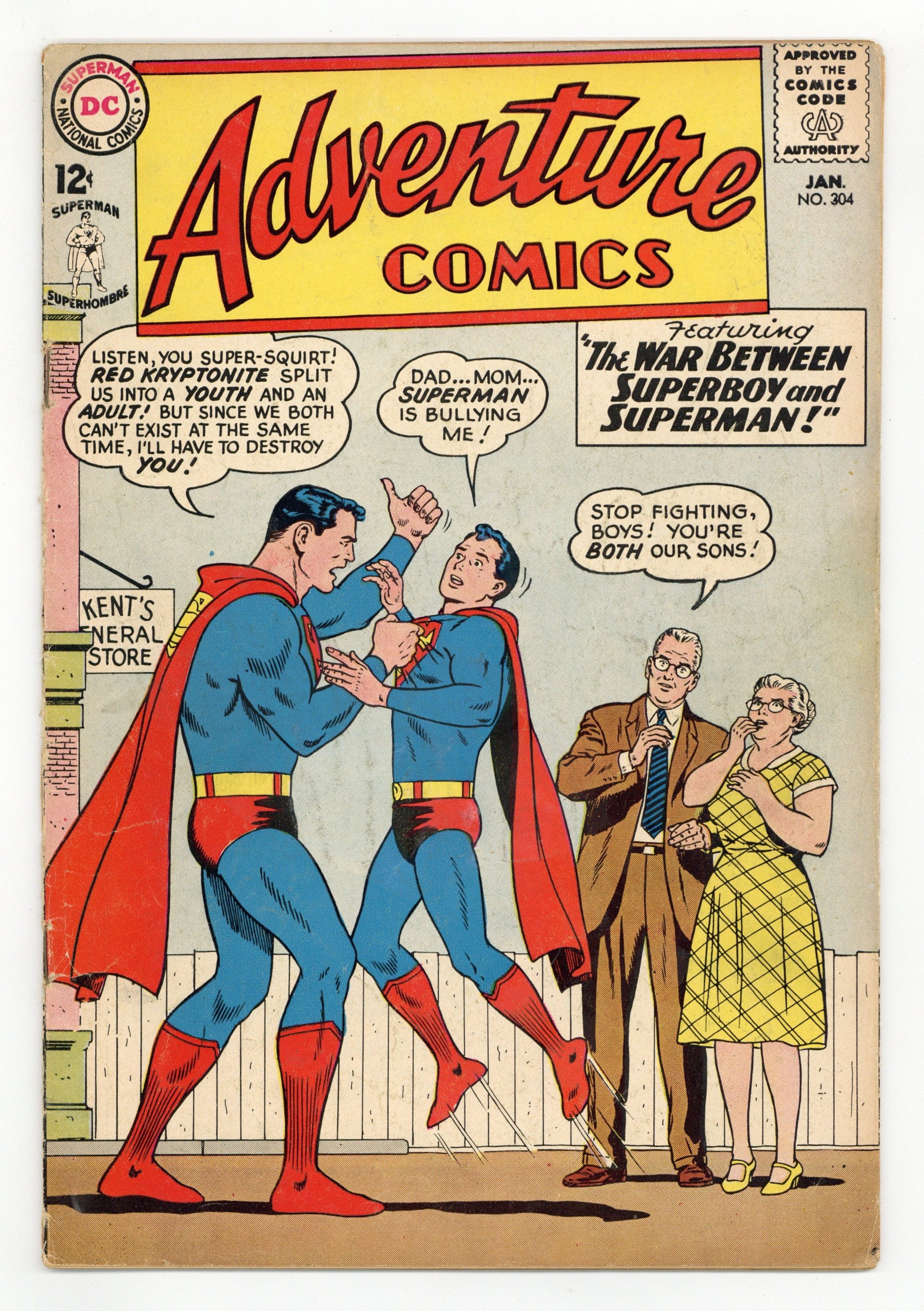Cover pencils by Curt Swan, inks by George Klein. The War Between Superboy and Superman, script by Jerry Siegel, art by George Papp; An adult version of Superboy appears to have been created by Red Kryptonite; only one version may remain. House ads for Superman Annual #6 and Batman Annual #4. Movie Ha-Lights humor page by Harry Lampert. The Stolen Superpowers!--Tales of the Legion of Super-Heroes, script by Jerry Siegel, art by John Forte; Saturn Girl tries to sacrifice herself after she finds out that a computer predicts the death of a legionnaire fighting Zaryan, but Lightning Lad dies instead. Casey the Cop humor page by Henry Boltinoff. 36 pages, Full Color. Cover price $0.12.