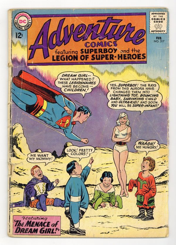 Cover pencils by Curt Swan, inks by George Klein. Part I: The Menace of Dream Girl!--Tales of the Legion of Super-Heroes, script by Edmond Hamilton, art by John Forte; Dream Girl joins the Legion and insists Lightning Lass be expelled when she loses her powers and demands Triplicate Girl be court-martialed for accusing her of causing Lightning Lass to lose her power. Super-Turtle humor page by Henry Boltinoff. Part II: The Doom of the Legion!--Tales of the Legion of Super-Heroes, script by Edmond Hamilton, art by John Forte; Even more Legionnaires are expelled before Dream Girl reveals to Star Boy that it was all a plot to prevent their deaths. In this two-parter, Lightning Lass becomes Light Lass, and the Hall of Fame series begins.The Shrinking of Superboy, art by John Sikela. 36 pages, Full Color. Cover price $0.12.