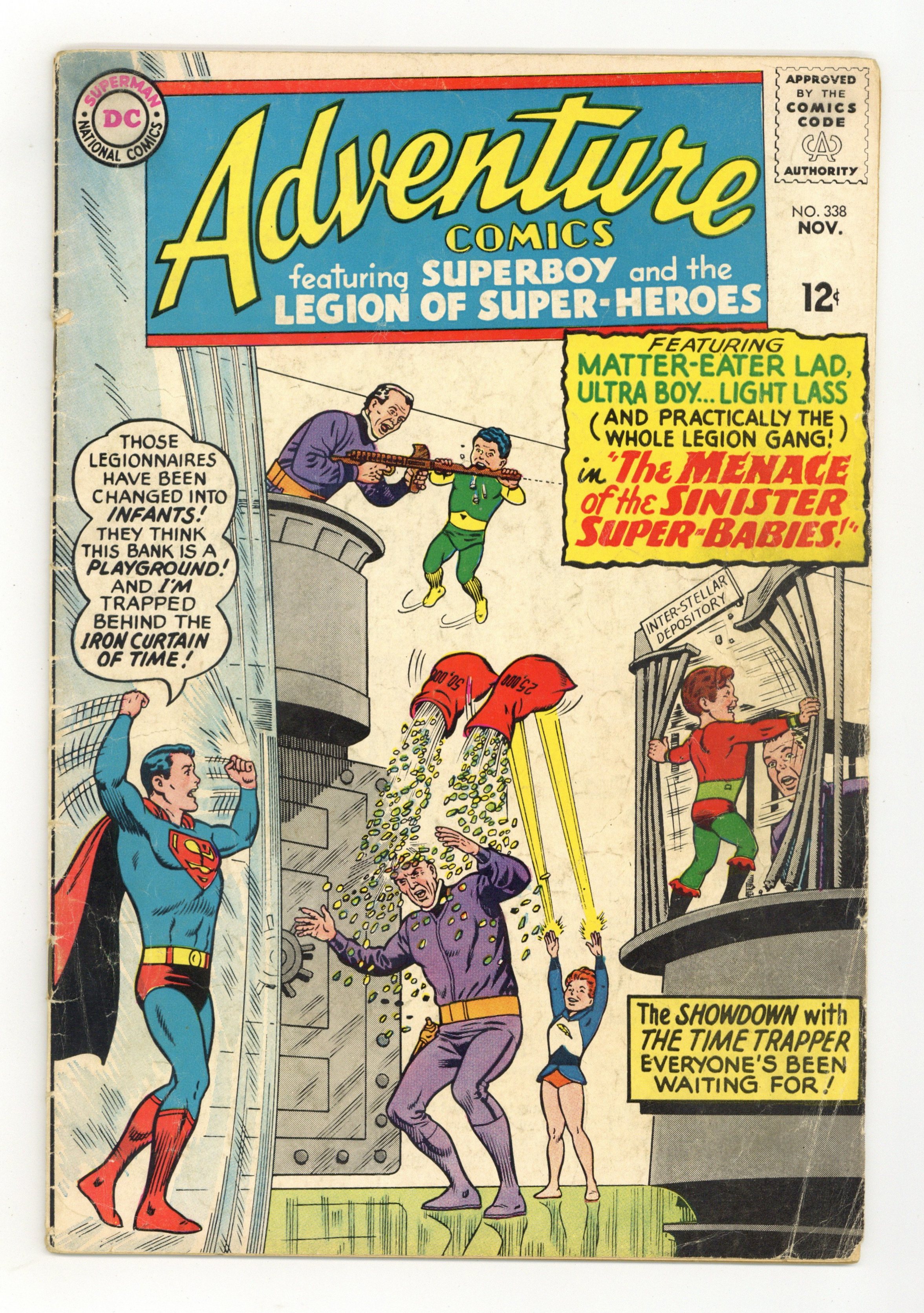 $22.50Cover pencils by Curt Swan, inks by George Klein. The Menace of the Sinister Super-Babies!--Tales of the Legion of Super-Heroes, script by Jerry Siegel, art by John Forte; The Time Trapper sends Glorith to turn the Legionnaires into children. The Game of Kriss-Kross Krypton, script by Otto Binder, art by John Sikela; Superboy appears to be affected by one of Lana's board games. Cap's Hobby Center activity page by Henry Boltinoff. Rocky and Bullwinkle star in a one-page Cheerios ad. 36 Pages, Full Color. Cover price $0.12.