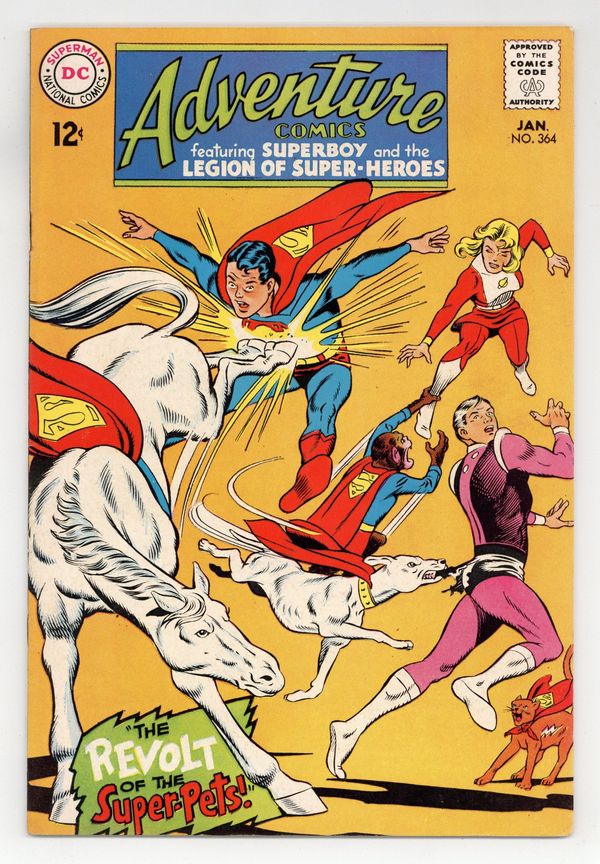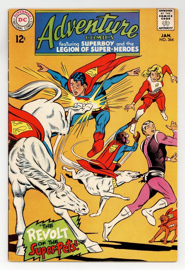 Starts Jan 3 Cover pencils by Curt Swan, inks by George Klein. The Revolt of the Super-Pets!--Tales of the Legion of Super-Heroes, script by Jim Shooter, pencils by Jim Shooter (layouts only) and Pete Costanza, inks by Pete Costanza; The Super-Pets depart for a world which they think appreciates them, but it turns out to be a gang of criminals. 36 Pages, Full Color. Cover price $0.12.