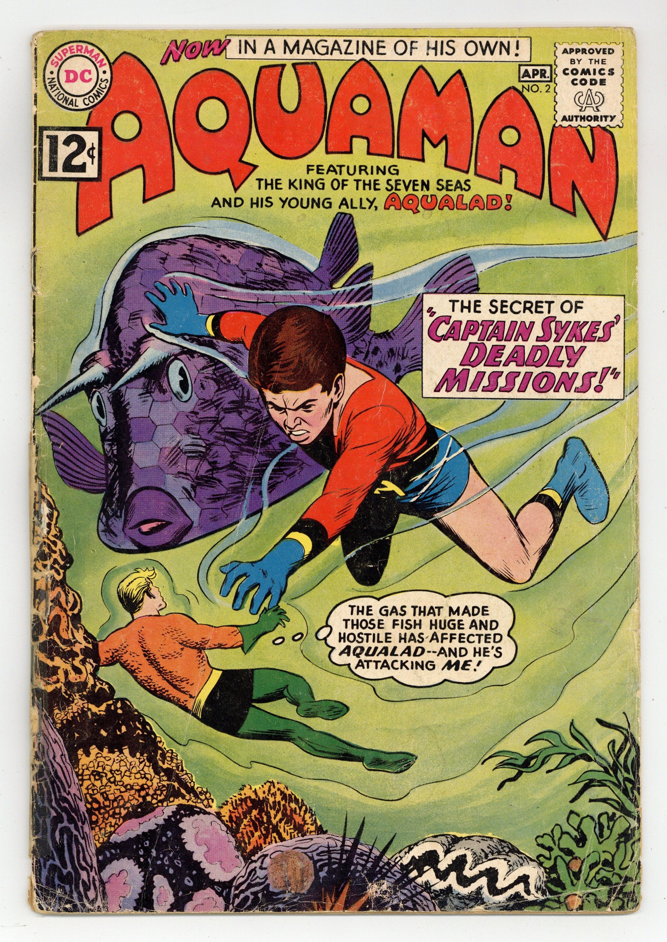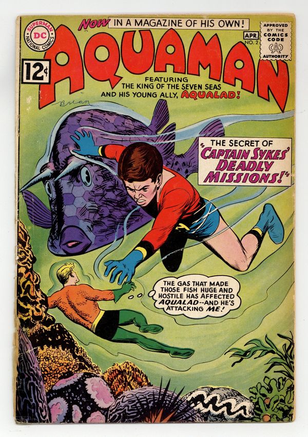 Cover art by Nick Cardy. Captain Sykes' Deadly Missions, script by Jack Miller, art by Nick Cardy; Aquaman and Aqualad must find two treasures for Captain Sykes or he won't release the ship he has captured. Ollie humor page by Henry Boltinoff. Facts on Fish educational page by Henry Boltinoff. The Fastest Fish Alive article. 36 pgs. $0.12. Cover price $0.12.