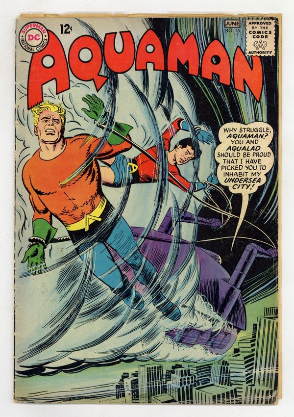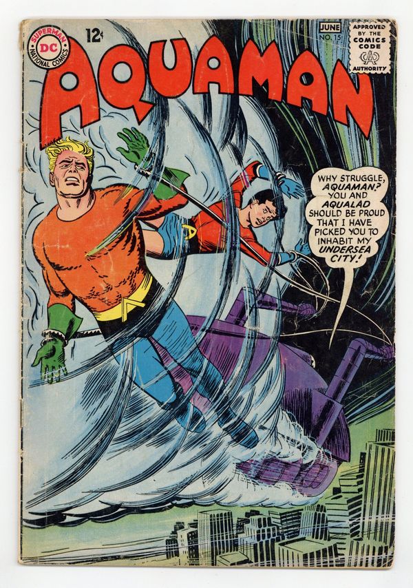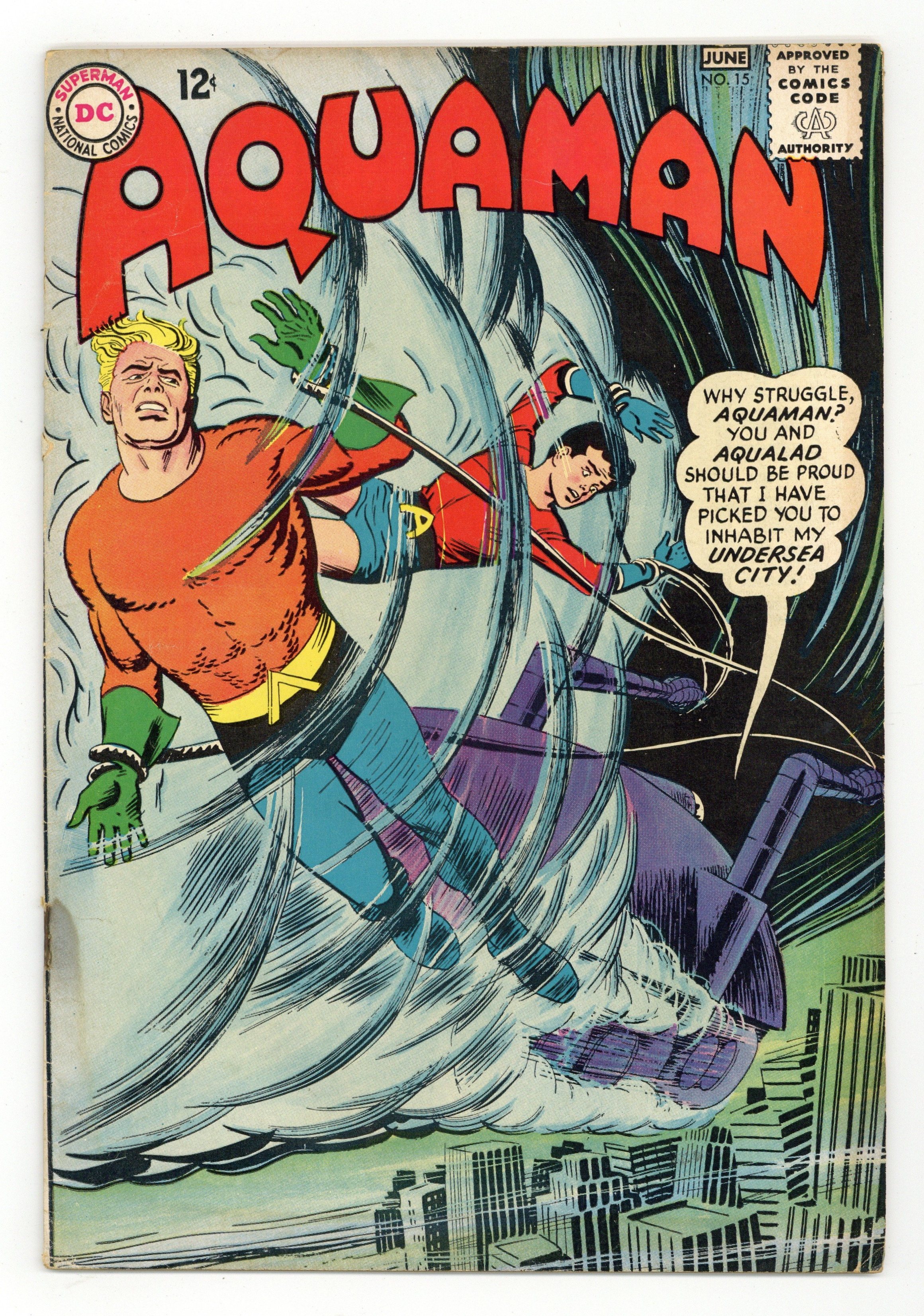 Cover art by Nick Cardy. Menace of the Man-Fish starring Aquaman, Aqualad, Mera, and Dr. Deering, art by Nick Cardy; during a botched experiment, Dr. Deering is changed into a water breather; he then proceeds to steal buildings and construct an underwater city. Underwater Oddities article. 36 pgs. $0.12. Cover price $0.12.