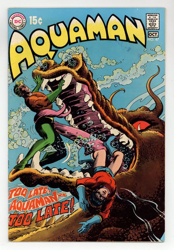 Cover art by Nick Cardy. Come the Revolution starring Aquaman, Aqualad, Mera, and Aquagirl; Narkran, script by Steve Skeates, art by Jim Aparo. The Adventures of Aquaboy!, script by Robert Bernstein, art by Ramona Fradon; Aquaman has to prove his existence to a blind man; flashback of Aquaman as Aquaboy when he was beginning as a hero. 36 pgs. $0.15. Cover price $0.15.