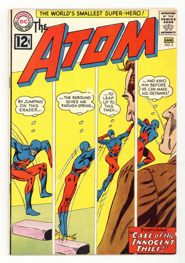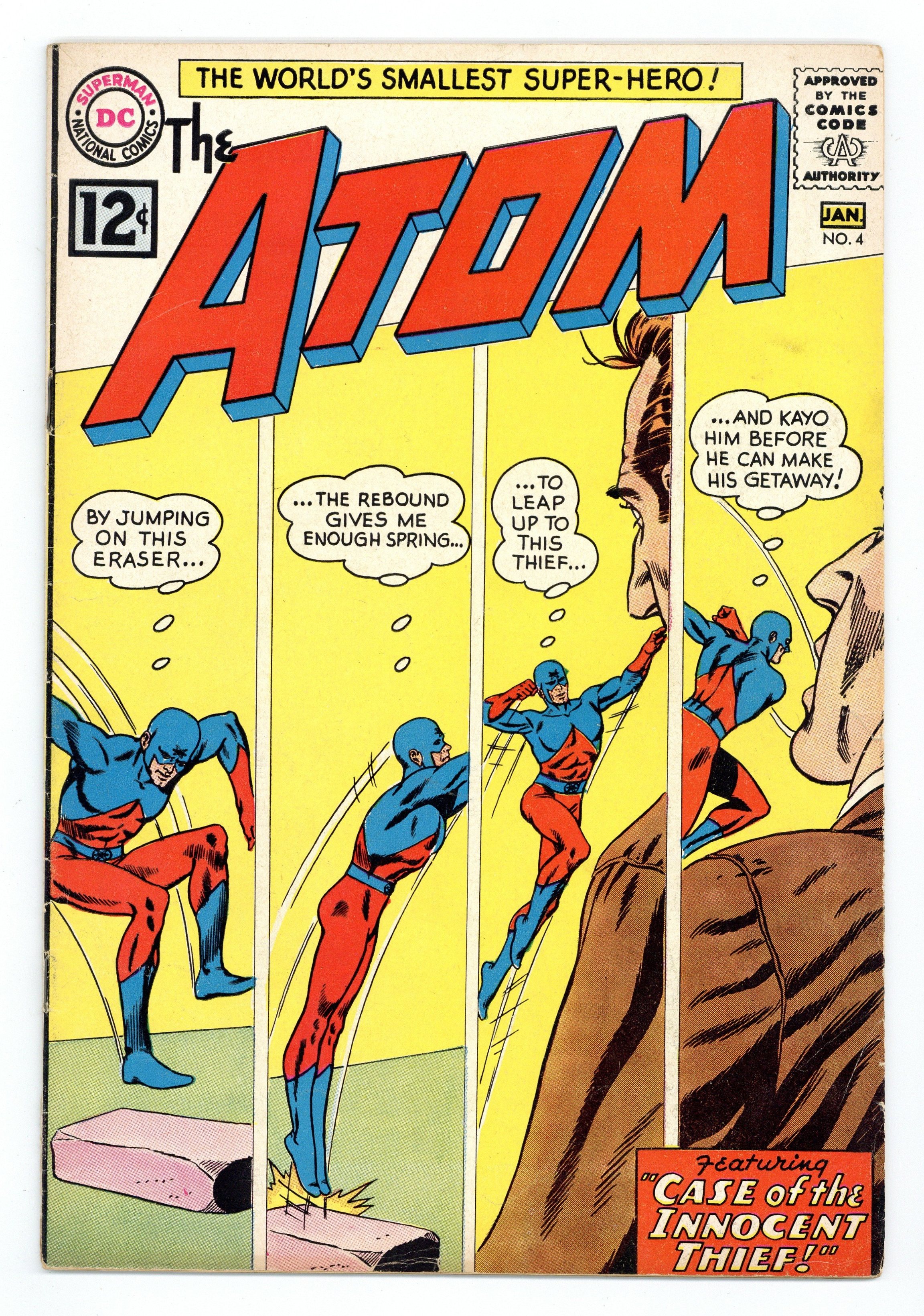 Cover pencils by Gil Kane, inks by Murphy Anderson. "The Machine That Made 'Miracles'!", script by Gardner Fox, pencils by Gil Kane, inks by Murphy Anderson; Traveling to Happy Harbor to give a speech to graduates at Snapper Carr's home, Ray witnesses as Snapper's boat suddenly goes from being an ordinary row-boat to a giant sail boat he wishes he has; Deciding to learn the cause of his mystery, Ray changes into the Atom and decides to secretly help Snapper, so that Snapper has a good story to share with his fellow Justice League members; When crooks realize that something around Happy Harbor is turning dreams into reality, they try to steal some dress jewels that have become real. "The Case of the Innocent Thief!", script by Gardner Fox, pencils by Gil Kane, inks by Murphy Anderson; When a series of crimes are committed by people who have concrete alibis that put them far away from the robbery, Ray Palmer decides to figure it out as the Atom. Letter to the editor from MyComicShop owner Buddy Saunders. 36 pgs., full color. $0.12. Cover price $0.12.