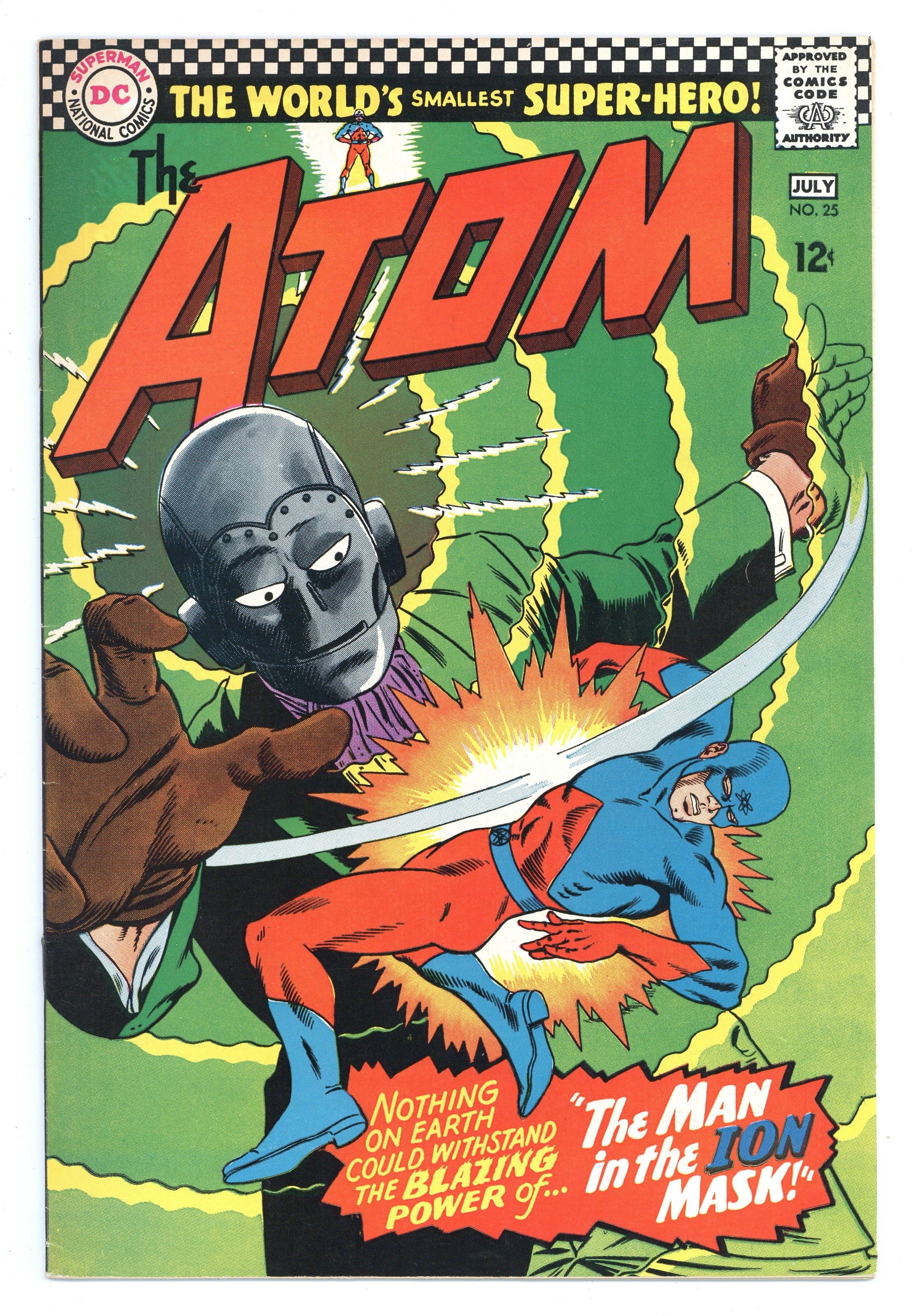 Cover pencils by Gil Kane, inks by Murphy Anderson. "The Man in the Ion Mask!", script by Gardner Fox, pencils by Gil Kane, inks by Sid Greene; The Atom fights a crook who wears a metal mask that emits ionic energy. Ad for Superman. Ad for The Inferior Five. "The Spy Who Went Out for the Gold!", script by Gardner Fox, pencils by Gil Kane, inks by Sid Greene; When Communist countries suddenly agree to pay their outstanding debts in gold, the Atom figures out that the gold is contaminated with deadly radiation. Ad for Swing with Scooter. Ad for Batman and Detective. Rocky and Bullwinkle star in a one-page Cheerios ad. 36 pgs., full color. $0.12. Cover price $0.12.