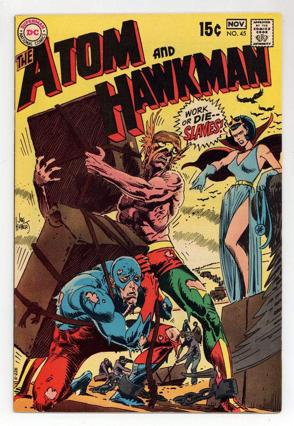 Final issue of the series. Cover by Joe Kubert. "Queen Jean, Why Must We Die?", script by Denny O'Neil, pencils by Dick Dillin, inks by Sid Greene; Jean Loring sees the face of a killer she had unsuccessfully defended on everyone she meets, and goes berserk; Ray Palmer tries to help her, and discovers that his Alpha Energy machine is radiating unusually; He locks Jean in a room, while he investigates the source as the Atom; In doing so, he encounters a tiny armored warrior, and has his arm coated in silver, as well as being irradiated by another Alpha-Ray machine; His only choice is to become large again, whereupon he finds that Jean is gone. Ray calls Carter Hall for help, and they find the armor is the same as that found in Death Valley, apparently left by aliens, so they travel there and find identical alpha emissions; Atom figures that Jean is being held in a sub-atomic world there, and, using his lens-sizer (seen in Hawkman #9), shrinks Hawkman to sub-atomic size; They land on the radiation's source planet, where they are immediately attacked by robot birds piloted by a crazed Jean, and both are knocked out. Letters to the editor from comics writers Mike Barr and Steven Grant. 36 pgs., full color. $0.12. Cover price $0.15.