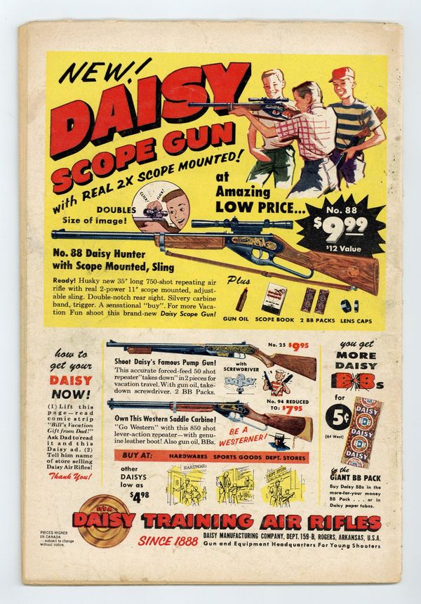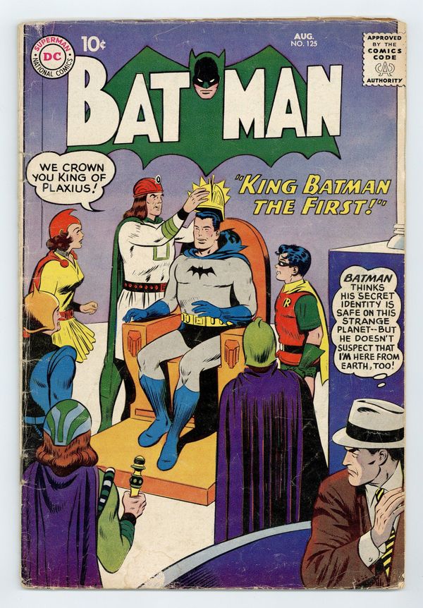 Ends Apr 27 7:27 PM CST Bid History 6 bids Current Bid $18 Your Secret Max Bid If you'd like to bid, please log in or register. Cover pencils by Curt Swan, inks by Stan Kaye. "The Secret Life of Bat-Hound," script by Bill Finger, pencils by Sheldon Moldoff (as Bob Kane), inks by Charles Paris; After Ace is brought to permanently live at Wayne Manor by John Wilker, Bat-Hound goes into action with Batwoman to save the Caped Crusaders trapped in a cave-in. Half-page Crime Punishment! story. Tips on Summer Fun! public service announcement with Peter Porkchops, art by Rube Grossman. "The Last Days of Batman," script by Bill Finger, pencils by Sheldon Moldoff (as Bob Kane), inks by Charles Paris; Carter Nichols sends the Dynamic Duo back to ancient Venice to gather evidence in a case, but only Batman returns, while Robin is shifted to Gotham City a few days into the future, where he discovers a new criminal will kill Batman. Half-page Warden Willis story by Henry Boltinoff. "King Batman the First," script by Bill Finger, pencils by Dick Sprang, inks by Sheldon Moldoff; While chasing down a wanted criminal, the Dynamic Duo are transported to another planet where Batman becomes king, albeit temporarily, as his being an alien causes him to be imprisoned. 36 Pages, Full Color. Cover price $0.10.