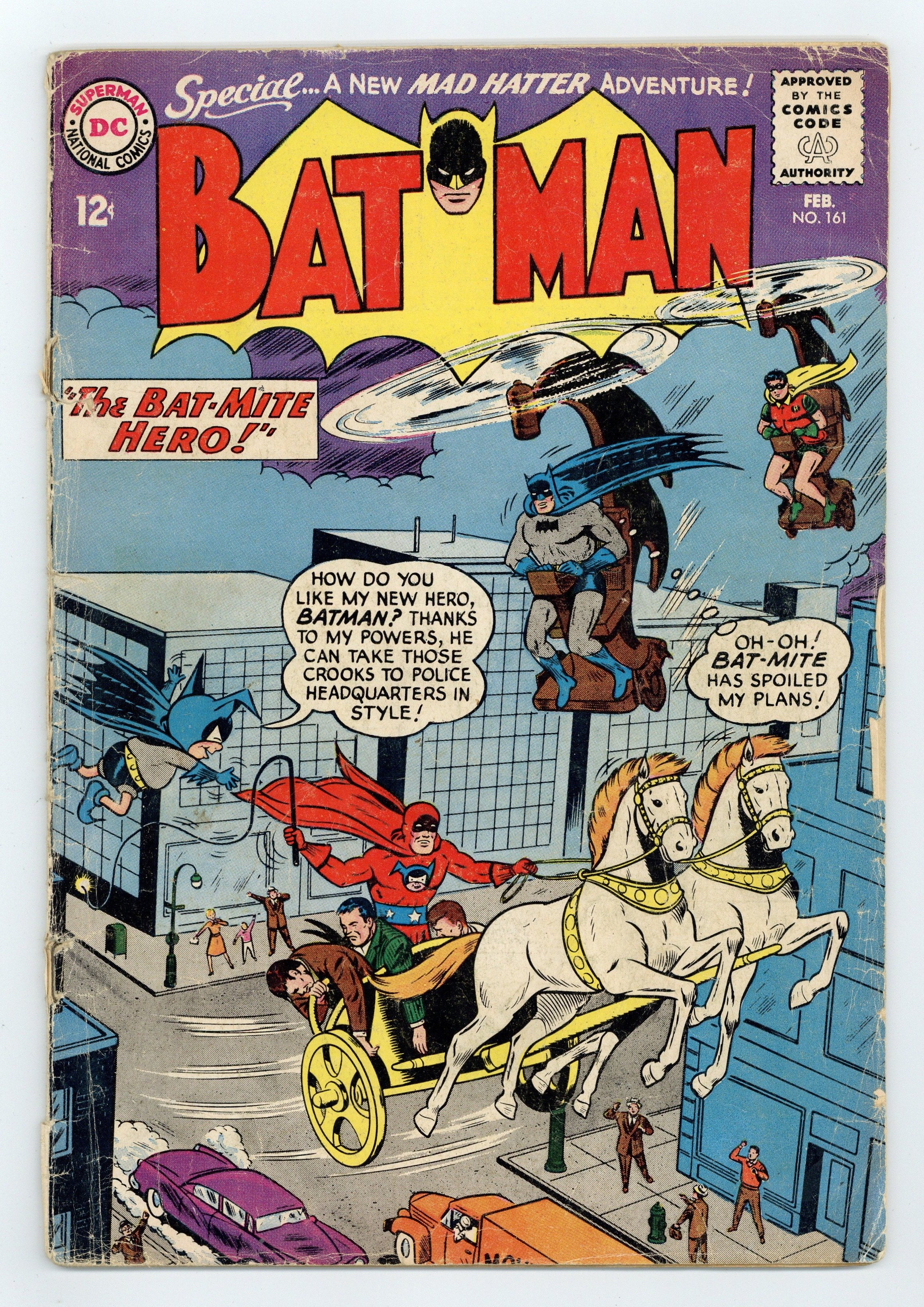 Cover art by Sheldon Moldoff. "The New Crimes of the Mad Hatter," script by Dave Wood, pencils by Sheldon Moldoff, inks by Charles Paris; The Mad Hatter pulls a string of robberies based on the professions of the jurors that sentenced him on his last arrest. Special Christmas Quiz -- "Christmas in Many Lands!" public service announcement, art by Ruben Moreira. "The Bat-Mite Hero," script by Dave Wood, pencils by Sheldon Moldoff, inks by Charles Paris; Batman corners a wanted felon in a baseball stadium, but Bat-Mite appears and messes things up with his magical nonsense. Batman tells him to find another hero to pester, so Bat-Mite creates a series of heroes (the third a crook), but they fail miserably. Half-page Casey the Cop story by Henry Boltinoff. 36 Pages, Full Color. Cover price $0.12.