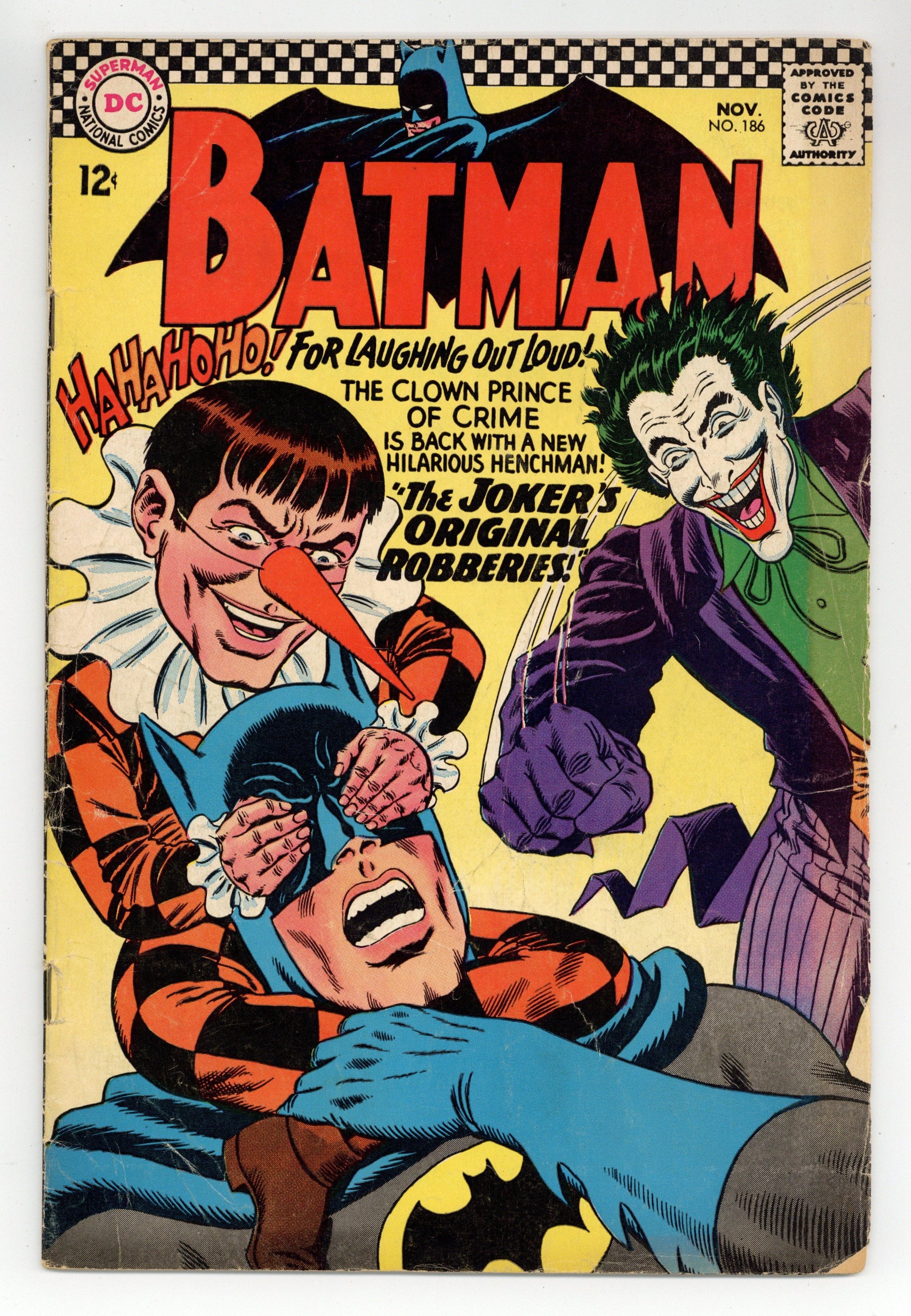 Cover by Murphy Anderson. "The Joker's Original Robberies!", script by John Broome, pencils by Sheldon Moldoff (as Bob Kane), inks by Joe Giella; The Joker returns to haunt the Caped Crusaders, this time with a new member added to his gang: Gaggy, who makes the Joker laugh, which then inspires the Clown Prince of Crime with new crime ideas. Lost--A Free Education! public service announcement with Binky, art by Bob Oksner. Cap's Hobby Hints activity half-page by Henry Boltinoff. Letter from future comics writer Mike Friedrich. "Commissioner Gordon's Death-Threat!", script by Gardner Fox, pencils by Sheldon Moldoff (as Bob Kane), inks by Joe Giella; Batman receives a call from Commissioner Gordon, informing him that Fred Purley (whom Gordon helped jail) has been paroled, and has made threats against the Commissioner; The Caped Crusader heads out to protect Gordon, not realizing that Gordon has been kidnapped and Purley has set a trap awaiting Batman. Letter to the editor from comics writer Mike Friedrich. 36 Pages, Full Color. Cover price $0.12.
