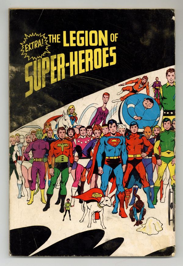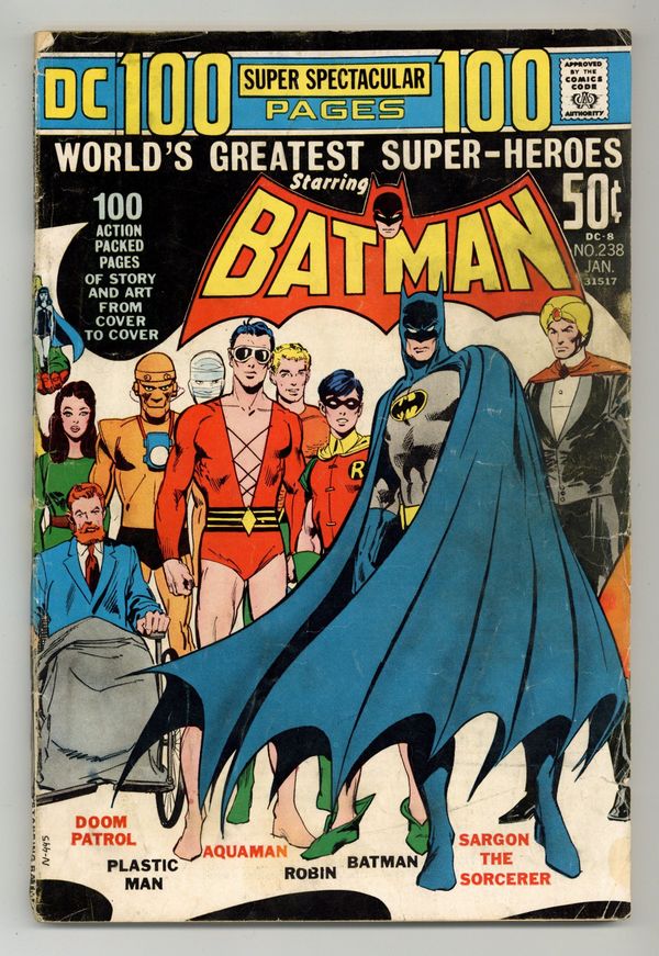 100-page Super Spectacular. Cover by Neal Adams. All reprints: "The Masterminds of Crime!" (from Batman # 70), script by David Vern Reed, pencils by Curt Swan, inks by Charles Paris; Batman disguises himself as the crook Drexel to infiltrate the Crime Academy. "The Origin of the Doom Patrol" (from My Greatest Adventure # 80), script by Arnold Drake (plot) and Bob Haney (script), pencils by Bruno Premiani; A mysterious man known only as the Chief calls three people who have all escaped certain doom but were left outcasts because of their experiences; He recounts their individual stories; He asks them to become the Doom Patrol, and their first mission is to defuse a bomb; The Chief informs the Doom Patrol of an alien spaceship that has landed on Earth carrying a super-weapon; General Immortus, spying on them, makes plans. "Oh Plastic Man" (from Police Comics # 14), art by Jack Cole; Woozy and Plastic Man set out to capture Eel O'Brian. "Guarding a Lion" (from Sensation Comics #57), script by John Broome, art by Joe Kubert; Sargon the Sorcerer must figure out who the mysterious person is who has been messing with the circus lion. "Danger in the Totem's Eye!" (from Adventure # 276), script and pencils by Arthur Adler, inks by Bob Oksner; Al Pratt goes to a museum to research Indian culture but ends up tracking down some robbers. "The Aqua-Thief of the Seven Seas!" (from Adventure Comics #276), script by Robert Bernstein, art by Ramona Fradon; Aquaman is falsely accused of stealing a chest of diamonds. "The Legion of Super-Outlaws!" (from Adventure Comics #324), script by Edmund Hamilton, art by John Forte; An evil scientist tricks the Heroes of Lallor into fighting the Legion. "Mr. Roulette's Greatest Gamble" (from Batman #75), script by David Vern Reed, pencils by Dick Sprang, inks by Charles Paris. A key that lists all the superheroes featured on the wrap-around cover. 100 Pages, Full Color. Cover price $0.50.