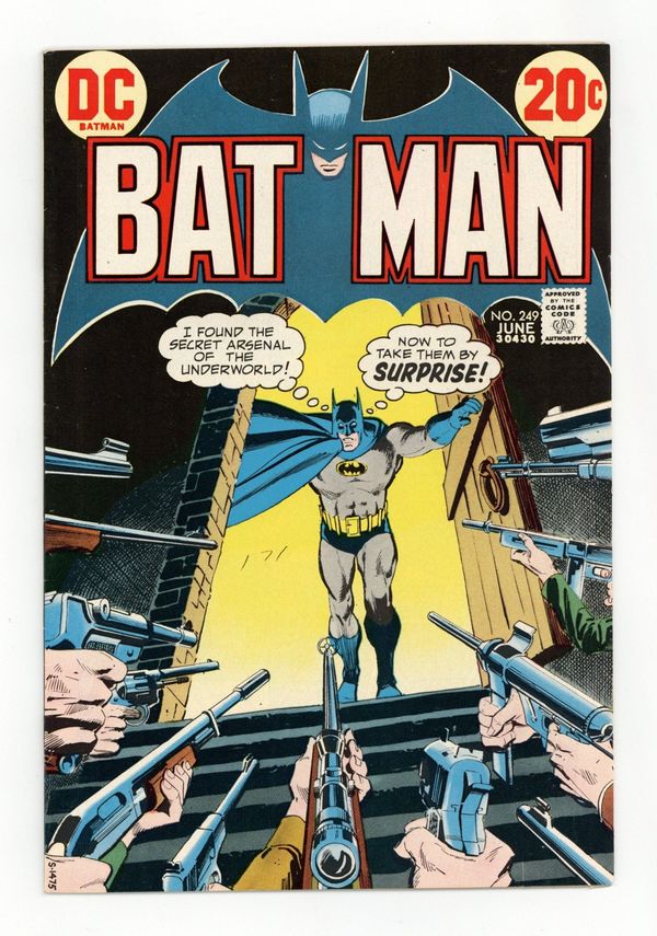 Tags: Batman$21.50Cover by Dick Giordano. "The Citadel of Crime," script by Frank Robbins, pencils by Irv Novick, inks by Dick Giordano; Batman tracks down the boss behind a gun-smuggling operation. "Case of the Kidnaped Crusader!", script by Elliot S! Maggin, pencils by Bob Brown, inks by Frank McLaughlin; Tom Carson, a consumer advocate, goes missing during the test drive of a new experimental car. 36 Pages, Full Color. Cover price $0.20.