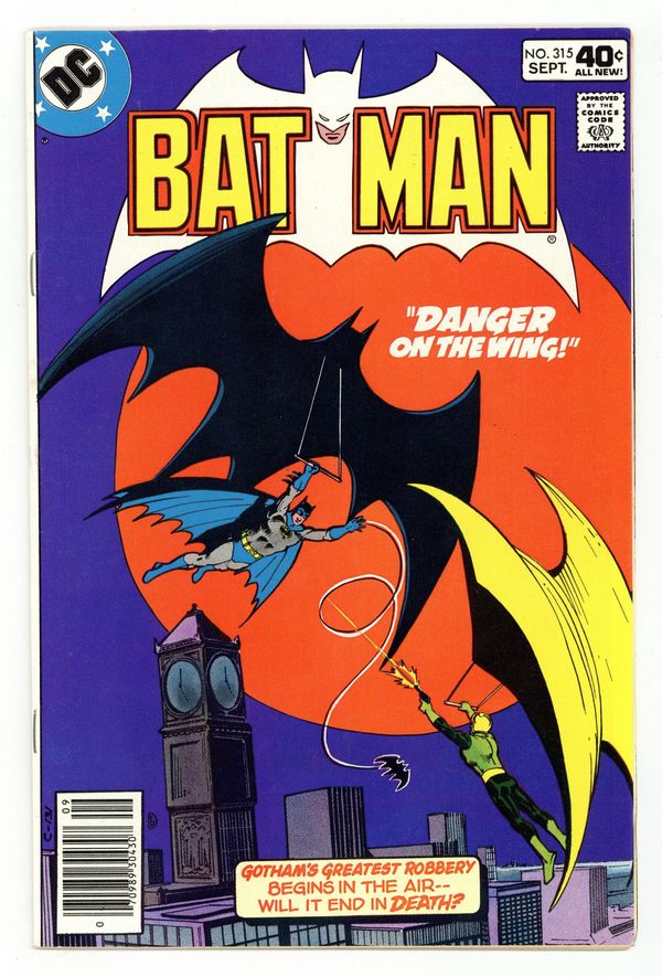 Tags: Batman$25.50Cover art by Dick Giordano. "Danger on the Wing!", script by Len Wein, pencils by Irv Novick, inks by Frank McLaughlin; Batman captures bad guys in Gotham City Hall, but not before one of them makes a kite of some blueprints and flies it to Kite-Man; Batman faces Kite-Man in a battle in the skies with the livelihood of many Gotham City citizens at stake. Answer Man DC questions and answers by Bob Rozakis. Golden Age Flash & Spectre parody strip by Fred Hembeck. 36 Pages, Full Color. Cover price $0.40.