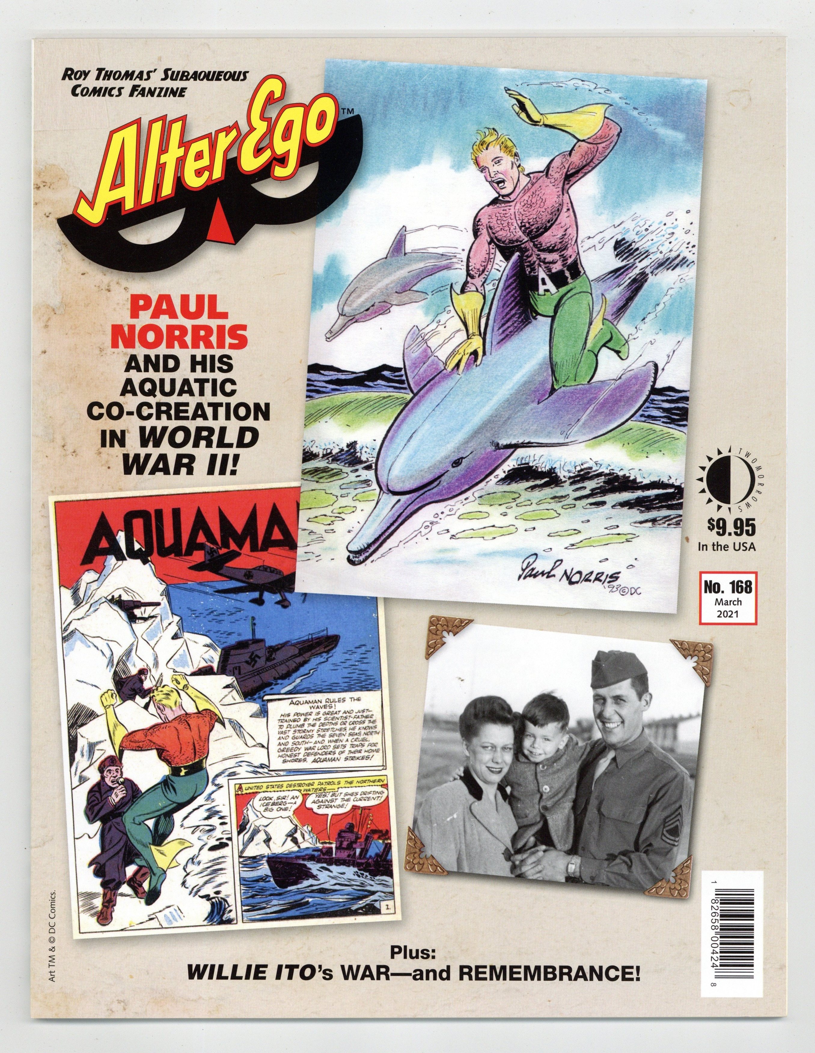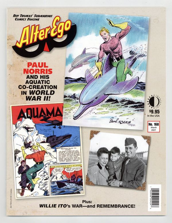 Published Mar 2021 by TwoMorrows.$11.00This issue of Alter Ego shows two very different sides of World War II, revealed in Richard Arndt interviews! The wartime life of Aquaman artist/co-creator Paul Norris, with a Golden/Silver Age gallery of art featuring Aquaman, Flash Gordon, Brick Bradford, and other fabulous heroes of comic books and strips - plus the story of Willie Ito, who endured the WWII Japanese-American relocation centers to become a Disney and Warner Bros. animator and to draw such comicbooks/strips as Pogo, Winnie the Pooh, Beany and Cecil, etc. Also: Mr. Monster's Comic Crypt: Raiders of the Lost Art - Michael T. Gilbert stripmines some gems from the 100-year-old Cartoons Magazine; Feel the Vern! - Part XV of the serialization of John Broome's memoirs, starring writer David V. Reed; Tributes to Mort Drucker and Cal Massey; Fawcett Collectors of America #227 - P.C. Hamerlinck presents Brian Cremins on Fawcett's Jackie Robinson Comics. Cover by Paul Norris. Edited by Roy Thomas. 80 pages, full color. Cover price $9.95.