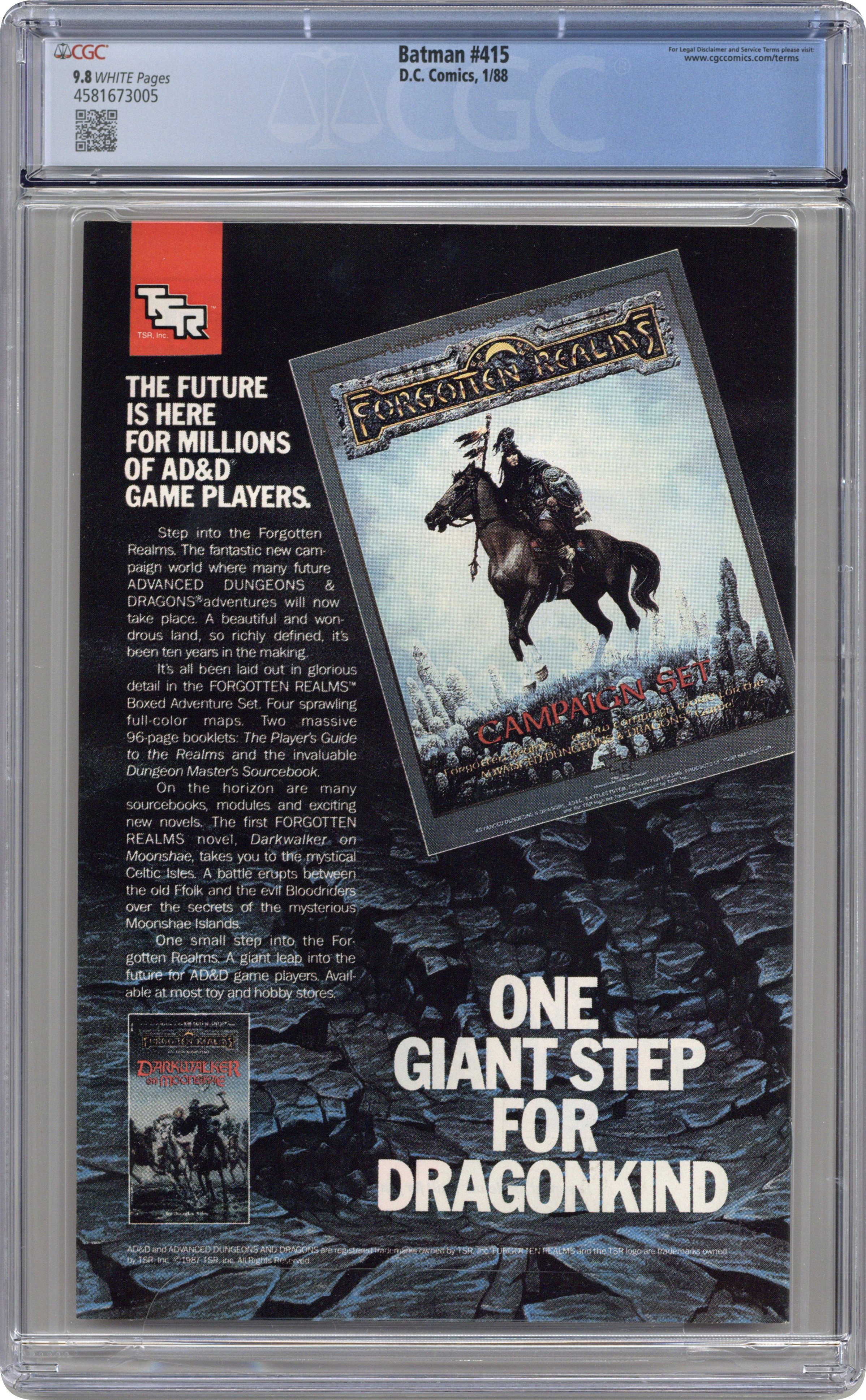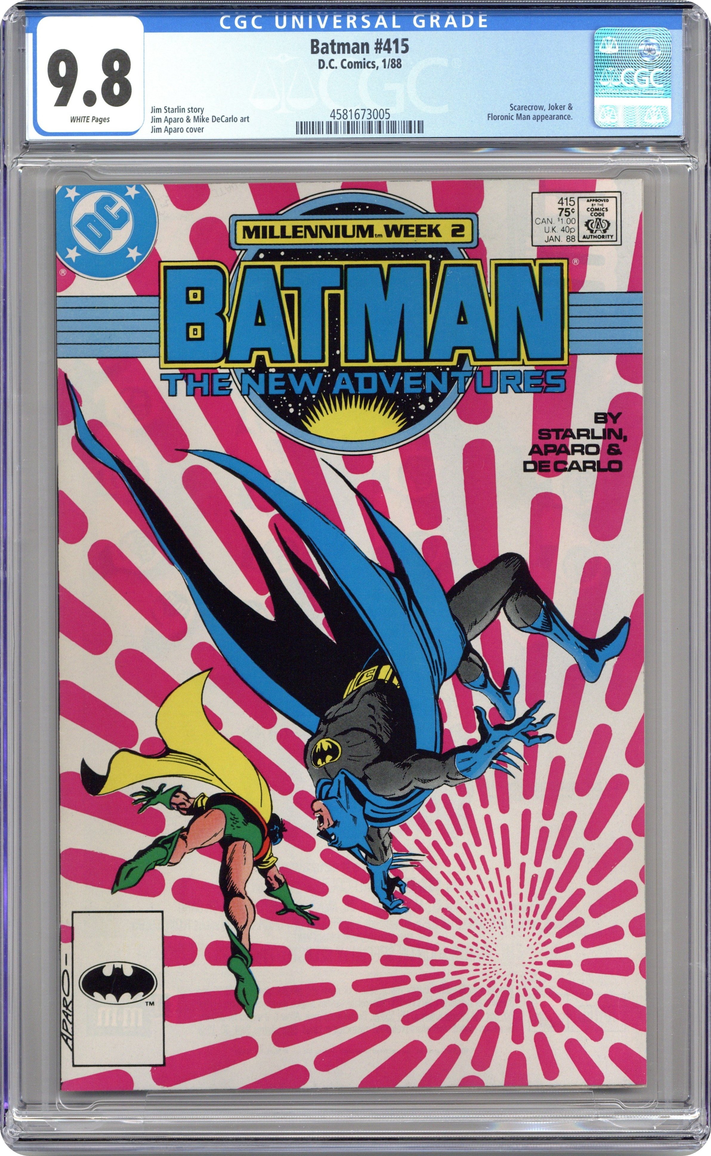 First Printing. Direct Edition. Millennium Week 2. Batman and Robin break in to Arkham Asylum to foil Commissioner Gordon's plans in "Millennium". Script by Jim Starlin, pencils by Jim Aparo, inks by Mike DeCarlo. The Scarecrow, the Floronic Man. Millennium story thread continues in Millennium #3. Aparo cover. 1st printing. NOTE: Most issues from 397-432 were reprinted in 1989 and sold in multipacks. These 2nd and 3rd prints have back cover ads dated 1989. 36 Pages, Full Color. Cover price $0.75.