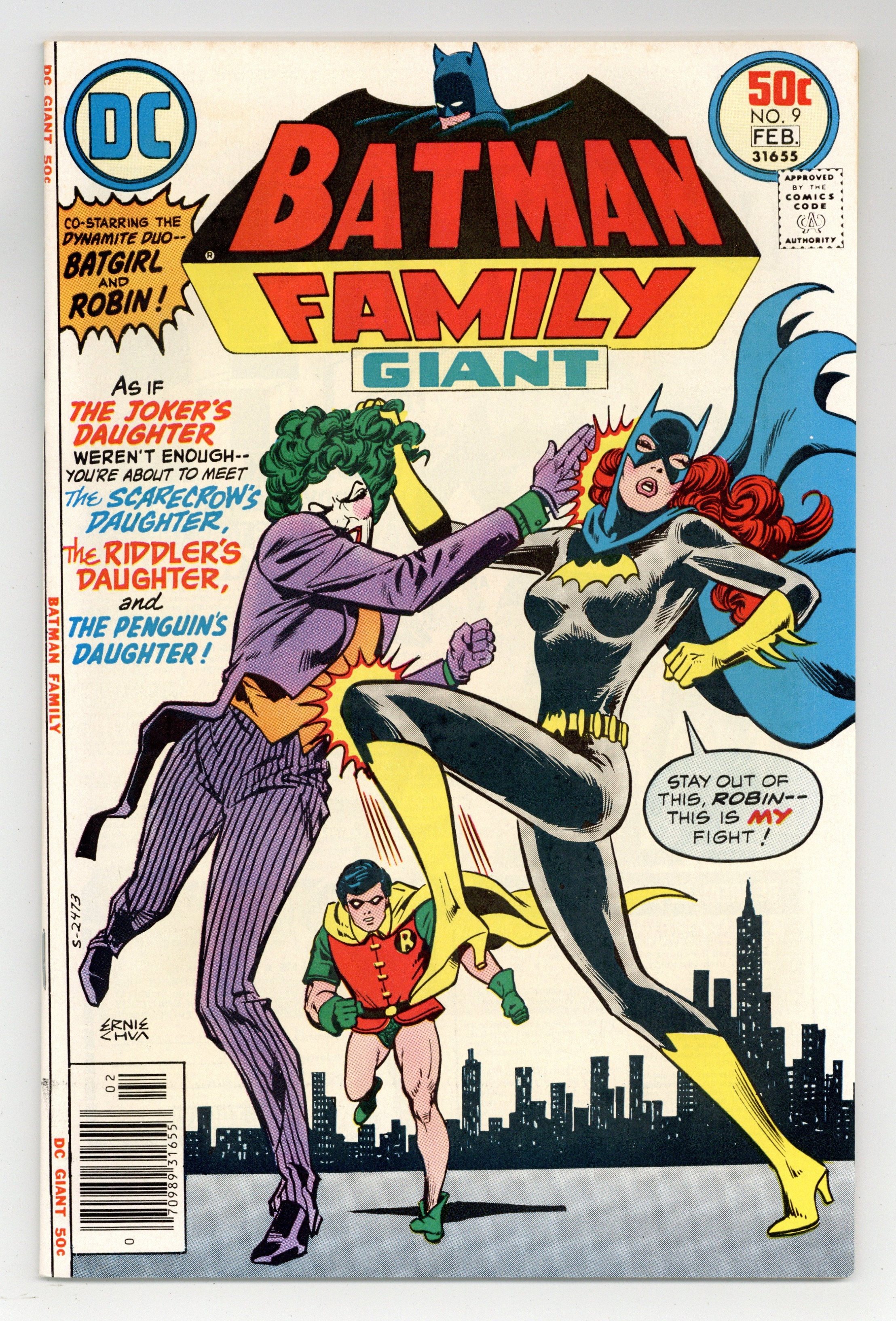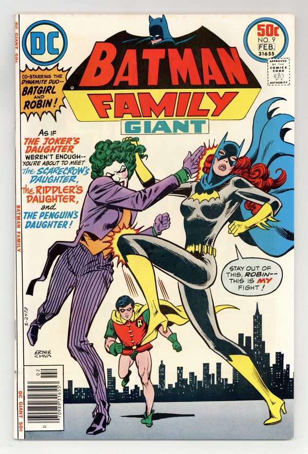 Giant-size issue. Batgirl and Robin have their hands full when they take on the daughters of the Joker, the Scarecrow, the Riddler, and the Penguin in "The Startling Secret of the Devilish Daughters!" Script by Bob Rozakis, pencils by Irv Novick, inks by Vince Colletta. Reprint back-up stories: Alfred stars in "Recipe for Revenge!" (art by Jerry Robinson); Batman and Robin star in "The Blockbuster Breaks Loose!" with script by Gardner Fox, pencils by Carmine Infantino, inks by Joe Giella. Ernie Chan (as "Ernie Chua") cover. 52 pages, full color. Cover price $0.50.