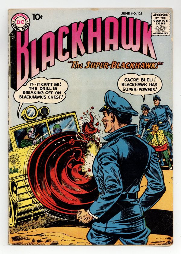 Stories by unknown. Art and Cover by Dick Dillin & Charles Cuidera. Three stories! "The Secrets of the Blackhawk Time Capsule" - The Blackhawks decide to bury the plans for their super-secret weapons in a time capsule to be opened only after their deaths, but the Schemer learns of this and digs it up, building one of the super-weapons for himself. Plus: "The Sunken Island" - A sunken island emerges from the sea, where the Blackhawks find the descendants of a 13th century Chinese shipwreck who live underground, in two warring factions. And: "The Super Blackhawk" - The Mole unleashes his atomic disintegrator beam on Blackhawk, but a malfunction gives him temporary super-powers instead of destroying him. 32 pages, full color. Cover price $0.10.