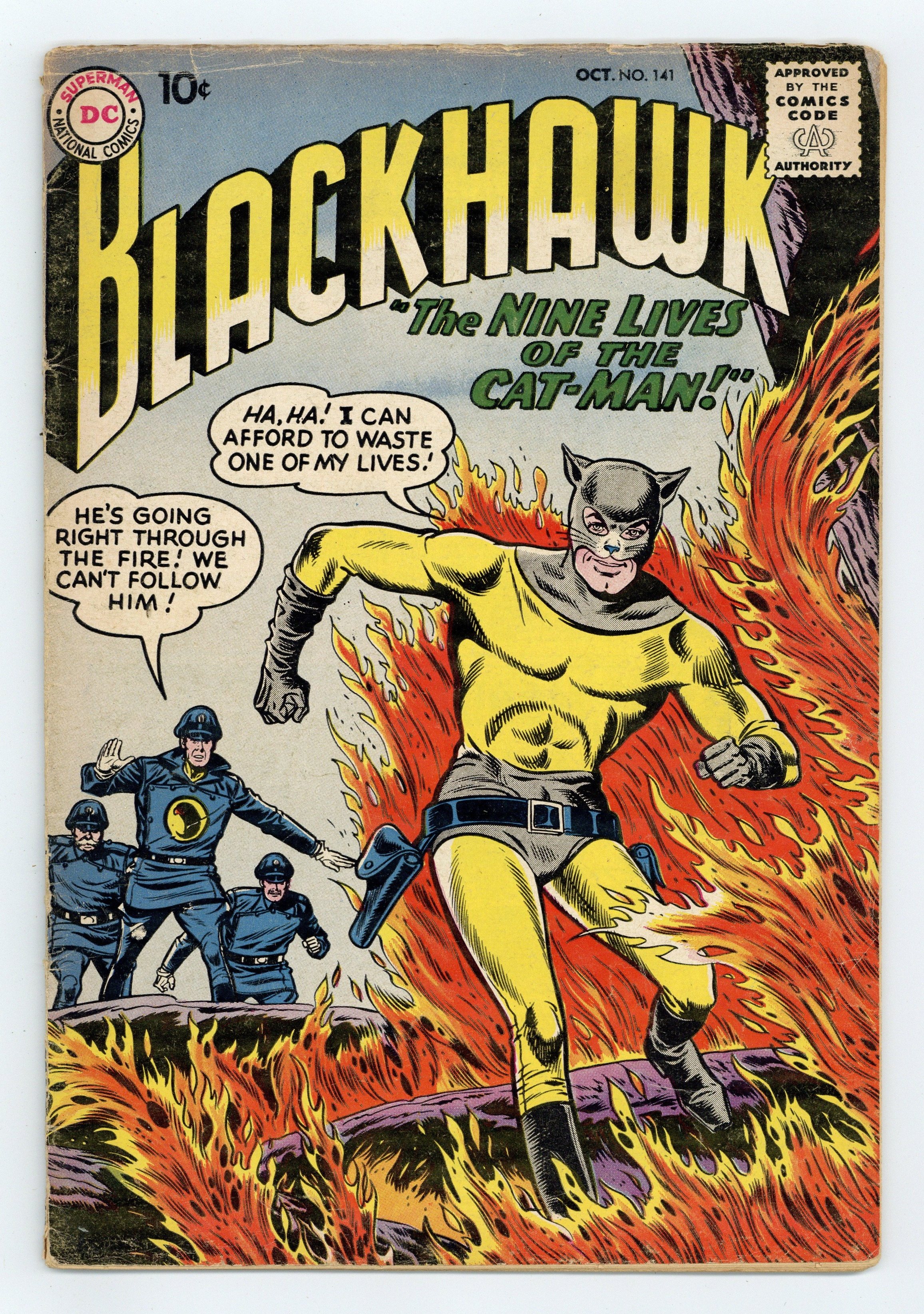 Cover by Dick Dillin & Charles Cuidera. Stories by unknown. Art by Dick Dillin, Charles Cuidera and Sheldon Moldoff. Three stories! "The Crimes of the Captive Masterminds" - The Crime Commander kidnaps leading scientists and forces them to create weapons for his ball-shaped Crime Fort. Plus: "The Blackhawk Housekeeper" - Hendrickson brings his Aunt Gretchen to visit Blackhawk Island, but she doesn't fit in with the Blackhawk's routine. And: "The Nine Lives of the Cat-Man" - The Cat-Man takes reckless chances to commit crimes because he was given eight extra lives by a witch doctor. Also: 1-page text story "Surprise for a Spy"! 32 pages, full color. Cover price $0.10.