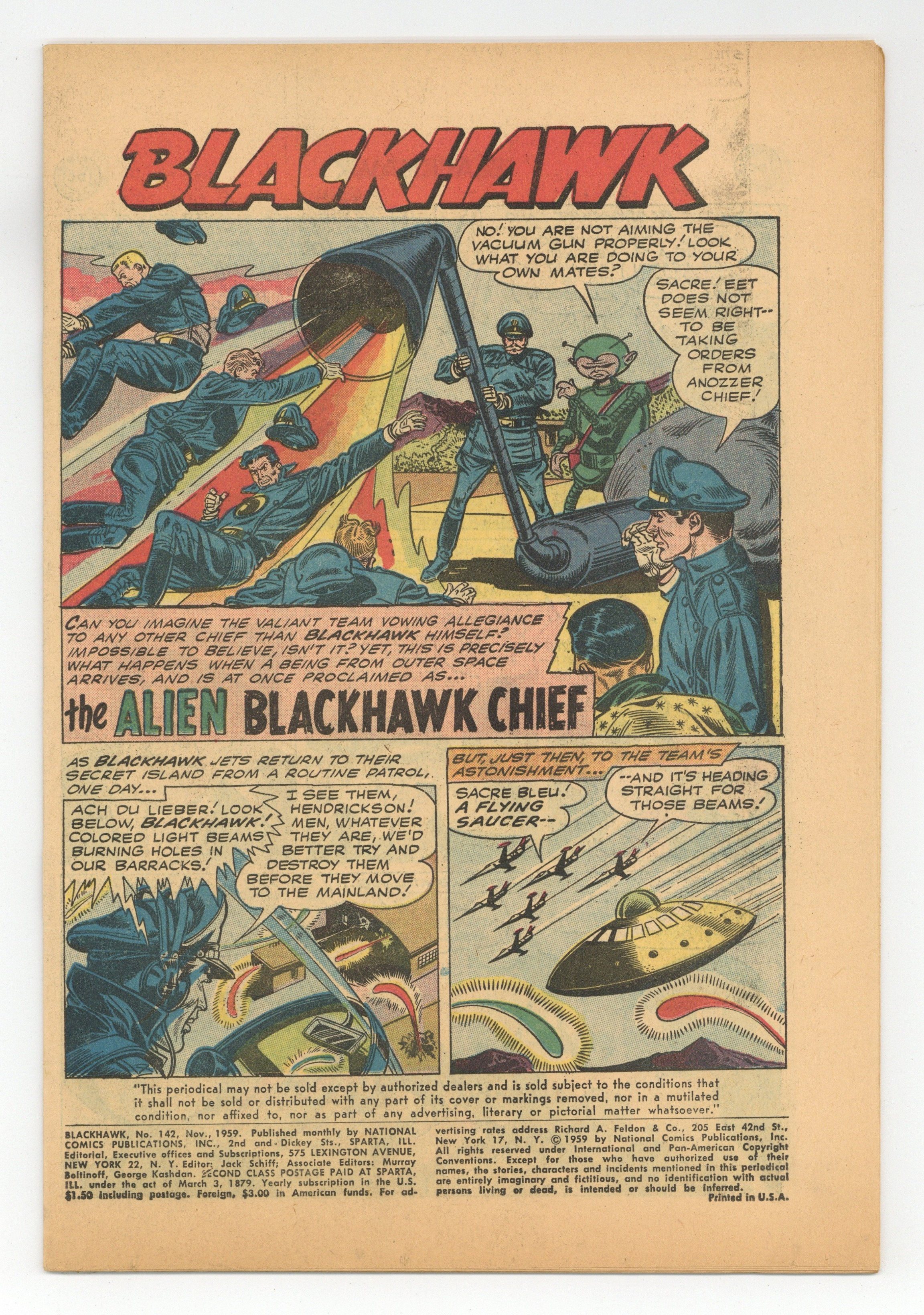 Cover by Dick Dillin & Charles Cuidera. Stories by unknown. Art by Dick Dillin, Charles Cuidera and Sheldon Moldoff. Three stories! "The Alien Blackhawk Chief" - A Venusian comes to Earth and enlists the Blackhawks help capture destructive space elements. After they capture the alien elements, the Blackhawks find they have helped the alien create an 'indestructible' creature. Plus: "The Super Blackhawk" - Andre gains superpowers when he eats a magic pellet while the team pursues Mr. Missile on a volcanic island. And: "The Iron Birds of Prey" - King Condor constructs an army of mechanical birds and uses them to commit crimes. He makes a fatal mistake when he captures Blackhawk's pet hawk, Blackie. 32 pages, full color. Cover price $0.10.