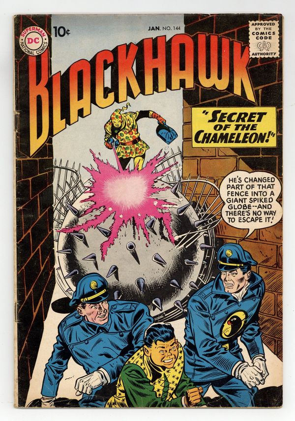 Cover by Dick Dillin & Charles Cuidera. Stories by unknown. Art by Dick Dillin, Charles Cuidera and Sheldon Moldoff. Three stories! "The Secret of the Chameleon" - The Chameleon's changed part of a fence into a giant spiked globe...and there's no way for the Blackhawks to escape it! Also featuring: "The Underworld Sportsmen" and "The Raid of the Fantastic Phantom"! 32 pages, full color. Cover price $0.10.