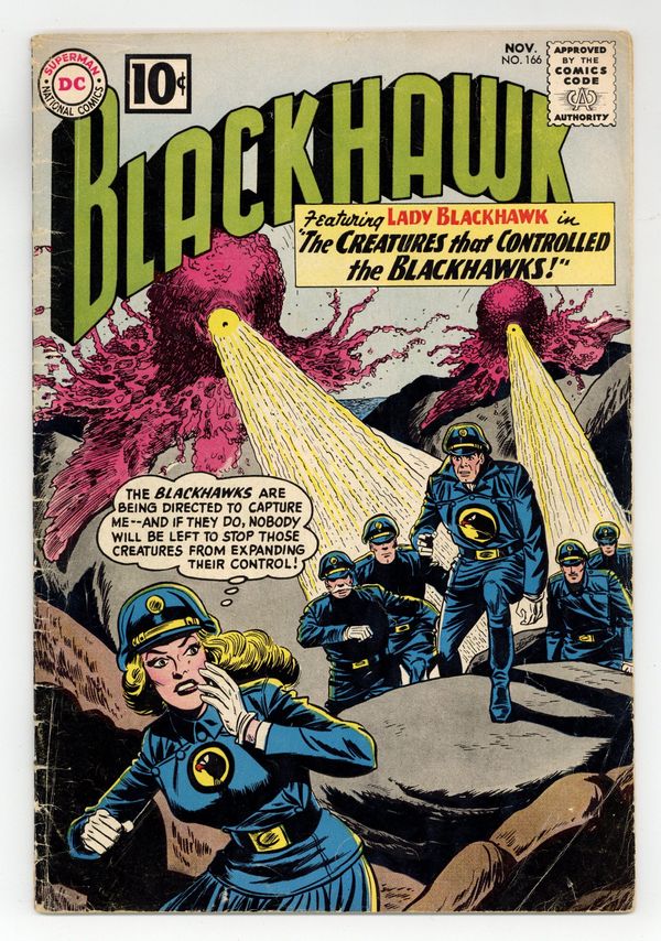 Last 10c cover priced issue. Cover by Dick Dillin & Sheldon Moldoff. Stories by Dave Wood? and unknown. Art by Dick Dillin & Charles Cuidera. Three stories! "The Creatures That Controlled the Blackhawks" - The Blackhawks are being directed to capture Lady Blackhawk...and if they do, nobody will be left to stop the creatures from expanding their control! Also featuring: "The Blackhawks' Unwanted Ally" and "The Menace of the Mystery Weapons"! Plus: 1-page text story "50 Feet To Freedom"! 32 pages, full color. Cover price $0.10.