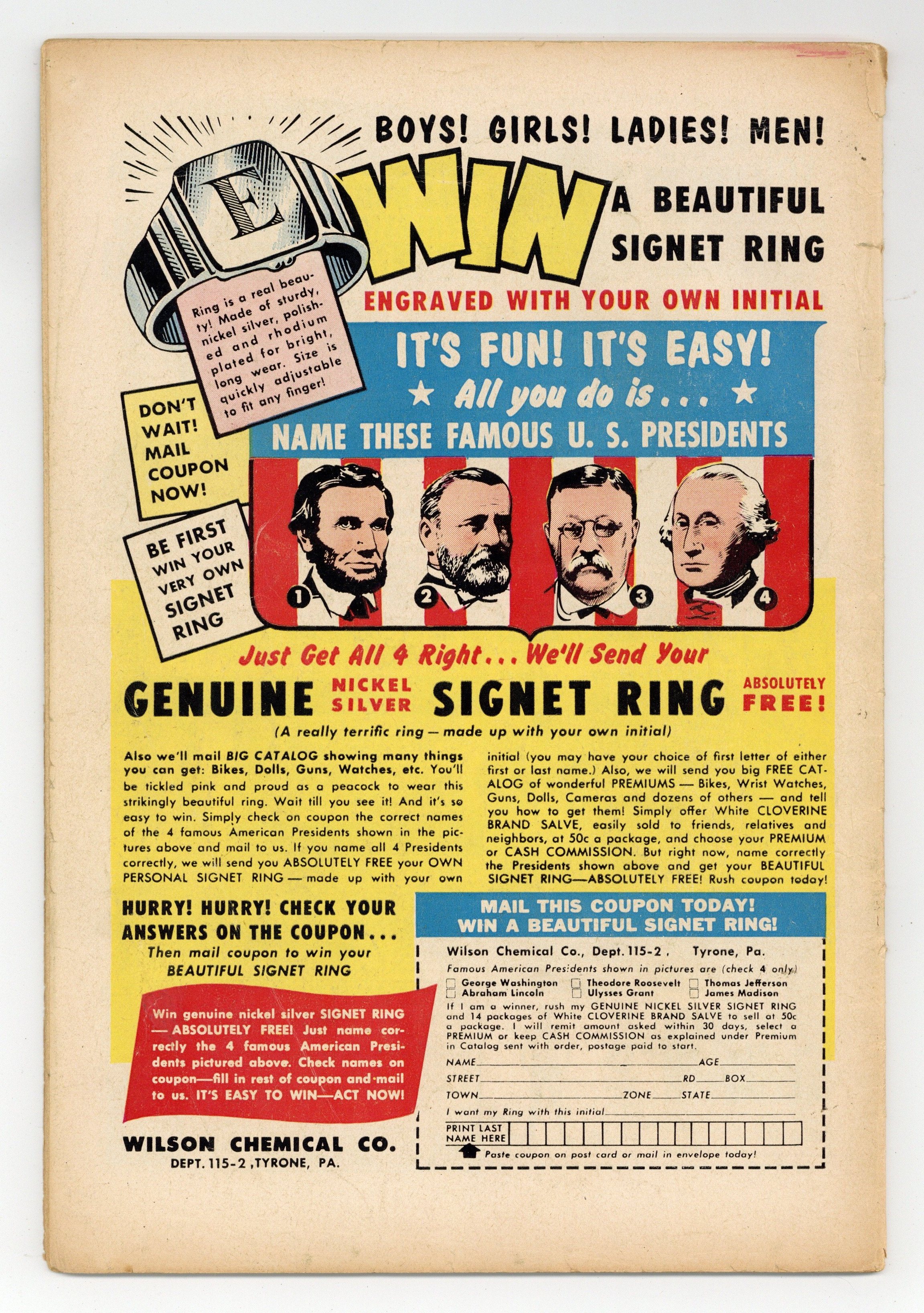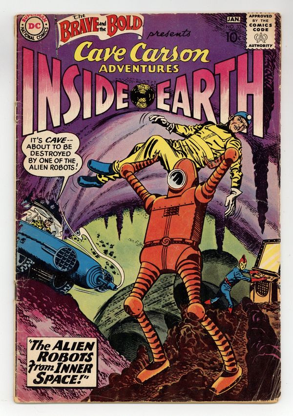 Cover by Bernard Baily. 3rd appearance of Cave Carson in "The Alien Robots from Inner Space," script by Dave Wood, art by Bernard Baily; A group of giant metal robots appear on the surface and begin destroying everything in sight!; Five miles underground, aliens have set up several basecamps with control consoles, with which they can control each robot; Cave and Bulldozer manage to hijack one of the control points and use one of the robots to fight off the others, while Christie helps direct them from the surface using the two-way radio. The Raiders from 20,000 Leagues text story. One-page Homer Goes Underground story by Henry Boltinoff. 36 Pages, Full Color. Cover price $0.10.