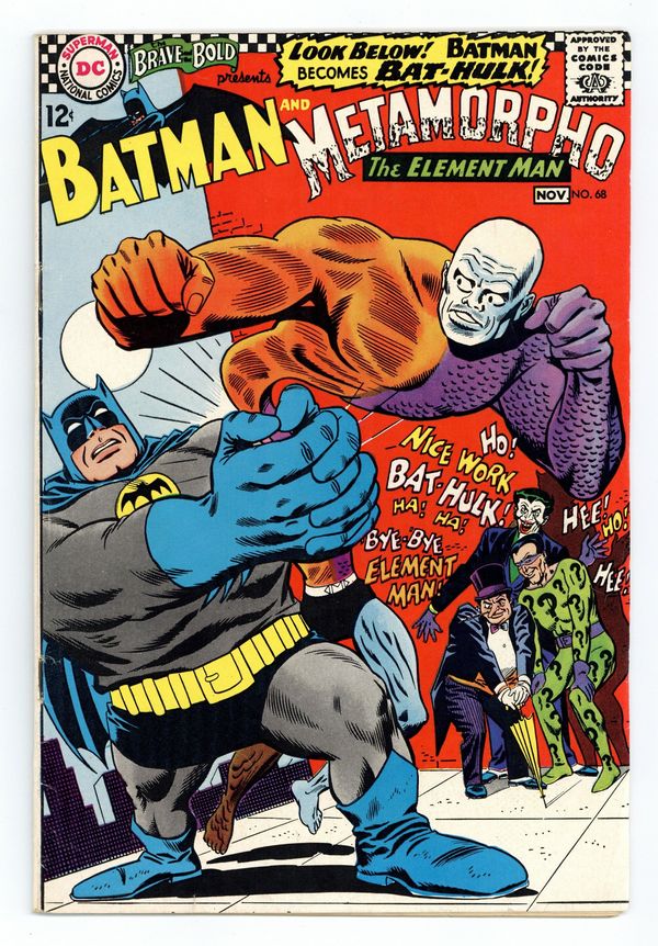 Tags: Batman$16.00Cover pencils by Mike Sekowsky, inks by Joe Giella. "Alias the Bat-Hulk," script by Bob Haney, pencils by Mike Sekowsky, inks by Mike Esposito; When the Riddler, Joker and Penguin team up together to commit a series of crimes to grab Batman's attention, he falls into their trap which leads to Batman being exposed to a chemical of the Joker's design that causes Batman to periodically change into a creature dubbed "Bat-Hulk", a giant muscle-bound creature who's touch can melt anything in its grasp; Changing back to human form, Batman seeks out the aid of Metamorpho to try and find a chemical combination to reverse the mutation, however Batman changes back into Bat-Hulk and goes on a rampage, before ultimately finding the Joker, Riddler, and Penguin and joining up with them in their next criminal plot; Metamorpho goes after the crooks, and battles the Bat-Hulk, clearly a Hulk parody. Ad for Batman and Robin Magic Photo Kit. Start a Hobby Today! page starring Willy and Dilly by Henry Boltinoff. 36 Pages, Full Color. Cover price $0.12.