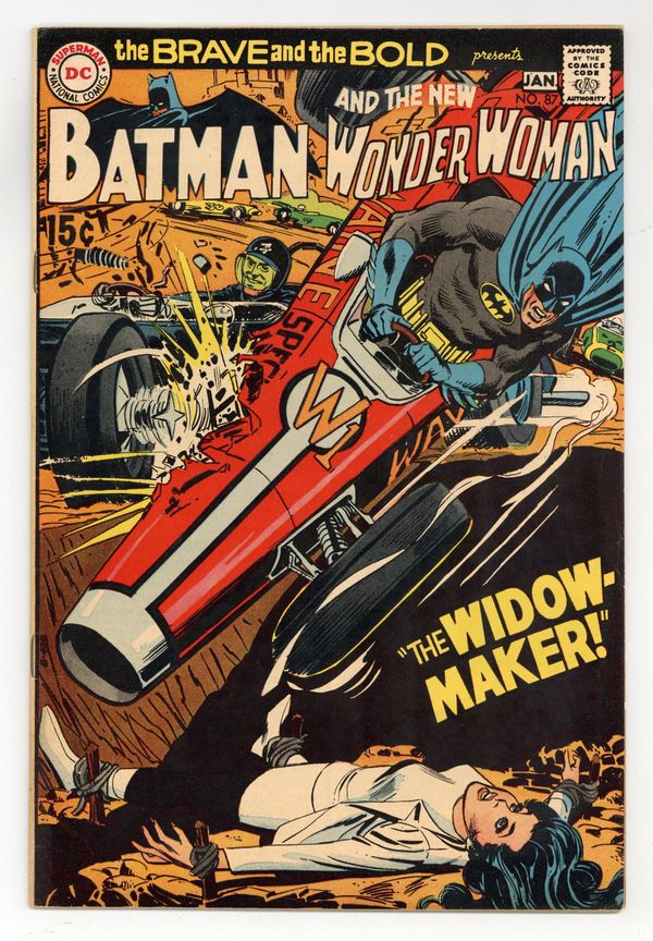 Cover pencils by Mike Sekowsky, inks by Dick Giordano. "The Widow-Maker!", script and pencils by Mike Sekowsky, inks by Dick Giordano; When Willi Van Dort (son of the Nazi war criminal General Van Dort) plans to use unsportsmanlike means to win a race by having Bruce Wayne attacked, Batman enters the race, and with the help of Wonder Woman and I-Ching wins the race instead of Van Dort, who was willing to win by any means, even murdering Batman; The plot is foiled with the help of Wonder Woman, Batman wins the race and Van Dort and his accomplices are arrested; Wonder Woman also gets into some trouble with the law when it turns out the car she thought was a rental was the wrong one and was reported stolen Also features a one-page text article titled "The Greatest Heroes of Them All," the first in a series recounting the heroes who previously appeared in Brave and Bold. This article covers the appearances of Golden Gladiator, Viking Prince, Silent Knight, Robin Hood, Col. Rick Flagg, and Cave Carson. One-page "A Matter of Life and Death!" story, script by Murray Boltinoff, art by Jack Sparling. Bio on Mike Sekowsky. 36 Pages, Full Color. Cover price $0.15.