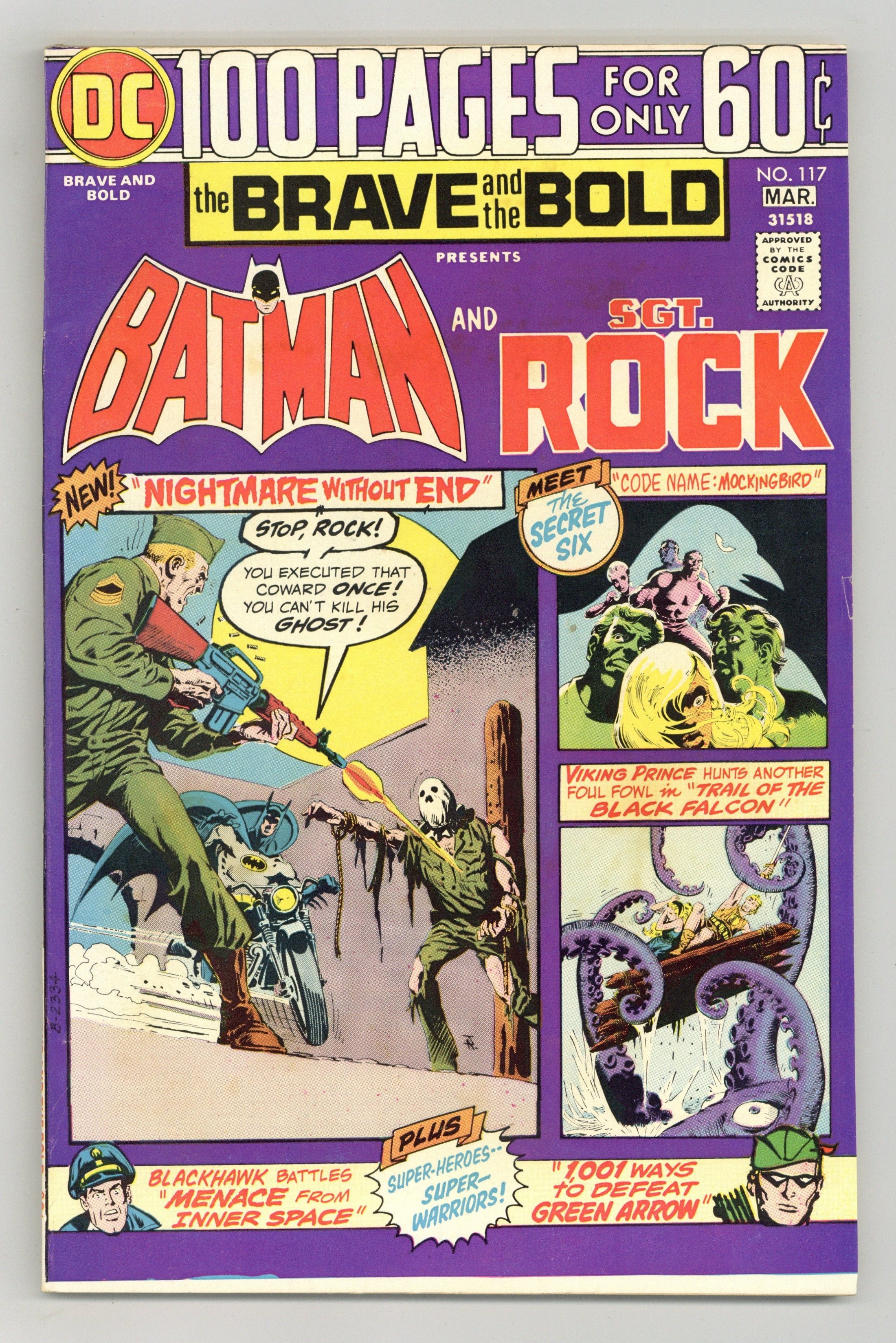 Last 100-page giant. Cover by Jim Aparo, Nick Cardy, and Joe Kubert. "Nightmare Without End," script by Bob Haney, art by Jim Aparo; As Batman muses over a poster of his old war buddy Sgt. Rock, he is attacked by mysterious men and taken aboard a plane; He soon realizes that his kidnappers are really Sgt. Rock's old unit, Easy Company, come to seek Batman's help. "Trail of the Black Falcon!" (from Brave and Bold 24), script by Bob Haney, art by Joe Kubert; During a voyage, King Rikk's vessel enters a pirate trap!; Jon and his beloved Asa follow his father's falcon, Reya the Black, to the Pirate's Den where Jon takes up arms against the pirate crew. "1001 Ways to Defeat Green Arrow!" (from Adventure 174), script by Ed Herron, art by George Papp. Super-Heroes - Super-Warriors! article by Allan Asherman, art by Joe Shuster (Superman panels) and Neal Adams (Batman & Sgt. Rock cover); Describes what Superman, Wonder Woman, Batman (with Sgt. Rock), and Captain Marvel Jr. did during World War II. "Code Name: Mockingbird!" (from Secret Six 1) starring the Secret Six, script by E. Nelson Bridwell, pencils by Frank Springer. "The Menace from Inner Space" (from Blackhawk 194) starring Blackhawk, script by Dave Wood, pencils by Dick Dillin, inks by Charles Cuidera. Letter to the editor from writer Arlen Schumer. 100 Pages, Full Color. Cover price $0.60.