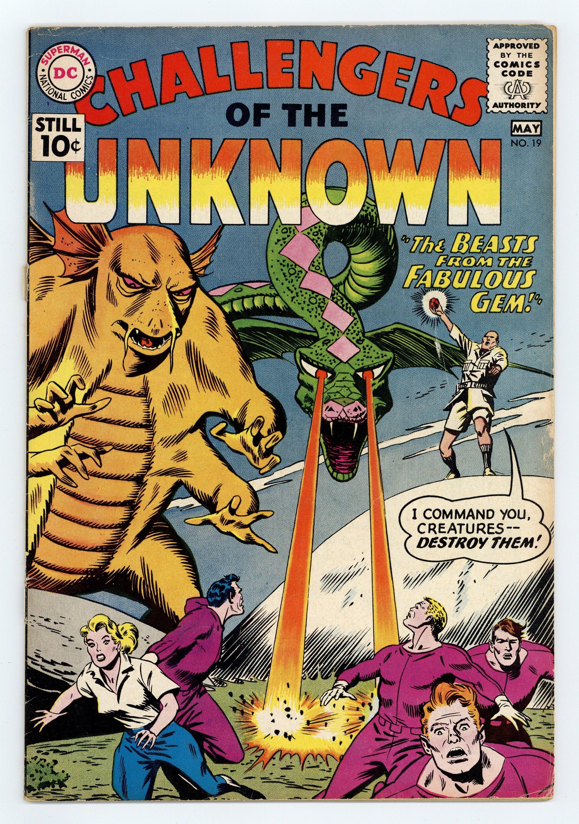 "The Alien Who Stole a Planet." The Challengers face a hostile crew member of a Noah's Ark-like alien ship. "The Beasts from the Fabulous Gem." A villain controls a sorcerer's stone that enables him to control a pair of monsters. Art and cover by Bob Brown. Cover price $0.10.