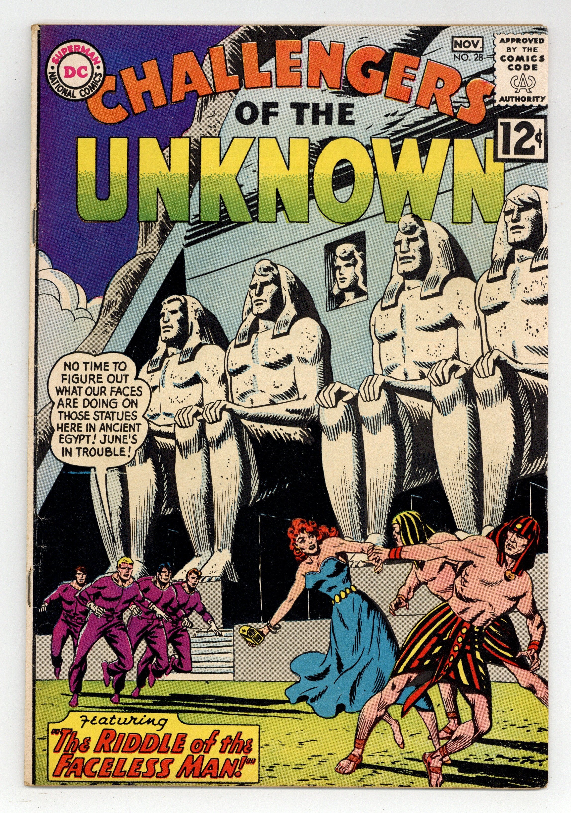 "The Revolt of the Terrible FX-1." The Challengers look to destroy a robot that has been driven insane by a bolt of lightning. "Riddle of the Faceless Man." The Challengers go back in time to solve the mystery of some statues that bear their likenesses and to rescue June from an evil Egyptian. Art and cover by Bob Brown. First letters page. Cover price $0.12.