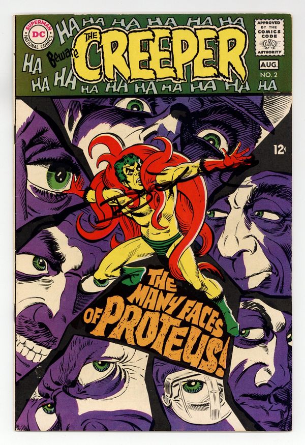 "The Many Faces of Proteus." The Creeper seeks the identity of and battles Proteus, who can change his appearance at any time. Proteus changed himself to look like The Creeper and committed a murder on television, forcing Creeper to try and clear his name. Script by Denny O'Neil (as Sergius O'Shaugnessy), art and cover by Steve Ditko. Cover price $0.12.