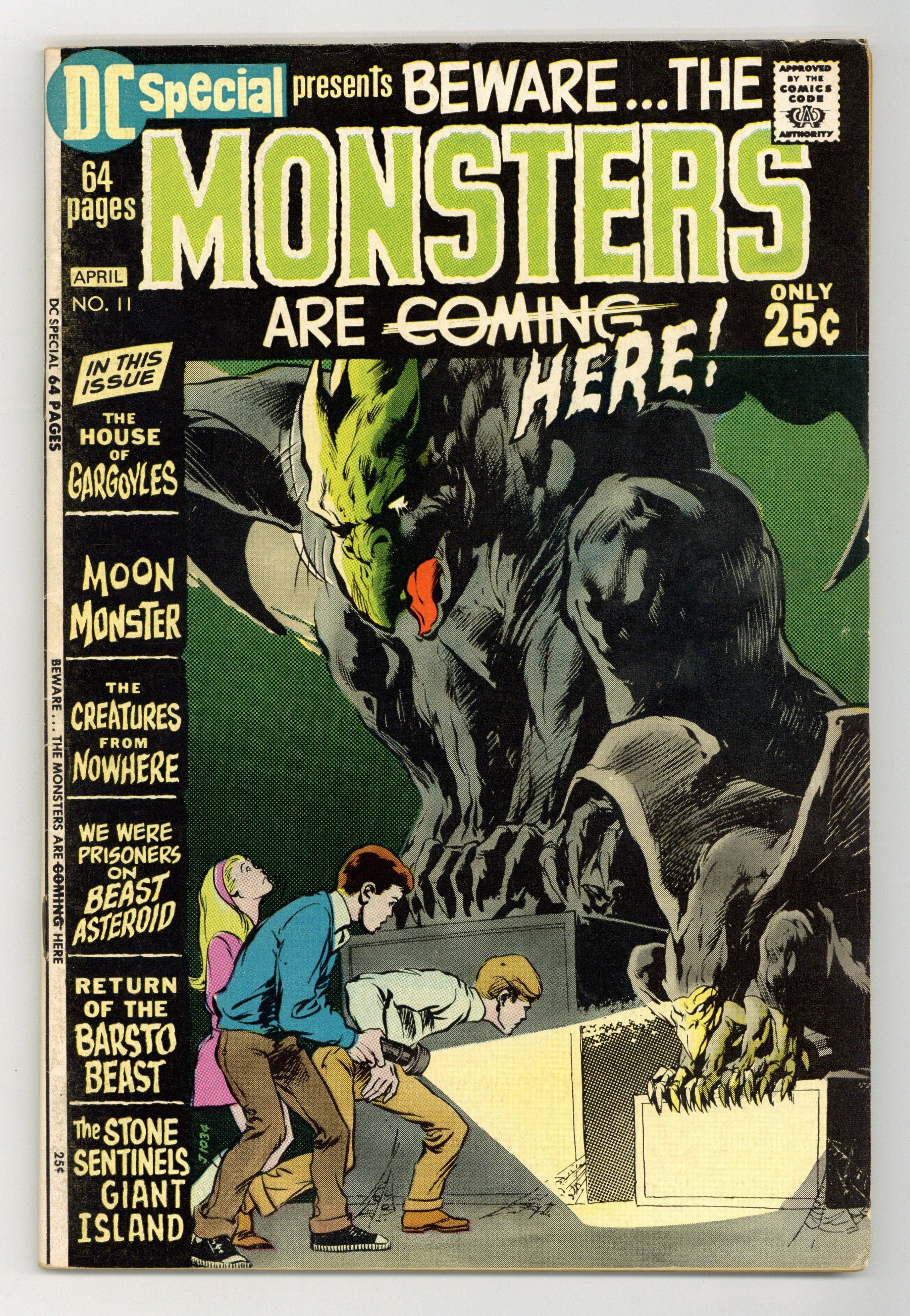 Monsters. Featuring: 1 page Cain intro story "Gadzooks!" drawn by Sergio Aragones; 11 page Cain reprint story "The House of Gargoyles!" written by Jack Oleck and drawn by Jack Sparling; 8 page Cain reprint story "The Moon Monster" drawn by Bernard Baily; 6 page reprint story "The Creatures from Nowhere!" drawn by Jack Kirby; 1 page Cain story "Welcome to Our Monster Convention!" drawn by Sergio Aragones; 7 page reprint story "Return of the Barsto Beast" drawn by Ruben Moreira; 8 page Cain reprint story "Prisoners on Beast Asteroid" drawn by Ruben Moreira; 1 page text story "Moonstruck" by Len Wein; 7 page Cain reprint story "The Stone Sentinels on Giant Island" drawn by Jack Kirby; 1 page Cain story "That's It, Kiddies!" drawn by Sergio Aragones. Cover by Neal Adams. Cover price $0.25.