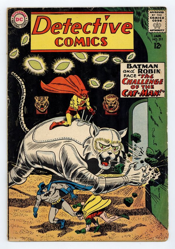 Cover art by Dick Dillin and Sheldon Moldoff. 1st appearance of Catman in "Challenge of the Cat-Man!" starring Batman, Robin, Cat-Man (intro), and Batwoman, script by Bill Finger, art by Jim Mooney; Tom Blake, a playboy and big-game hunter, is inspired by the memory of the Catwoman and his pet black panther to become the Cat-Man, a costumed thief, using cat-gimmicks and cat-motifs in his robberies; Batman, Robin, and Batwoman stand against Cat-Man and they confront the criminal on a couple of occasions until Batman is able to deduce Cat-Man's secret identity; When the Dynamic Duo find Cat-Man's lair, they fall into a trap, but Batman finds a way out after which Cat-Man tries to escape, but falls to a nearby river and is dragged away by the current. Strange Old Laws humor page by Henry Boltinoff. "The Invaders from the Space Warp" starring John Jones Manhunter from Mars, script by Jack Miller, art by Joe Certa; When alien criminals from another dimension escape to Earth, Manhunter rounds them all up, but they accidentally leave their pet Zook behind. Touchdown for Picasso! public service announcement, script by Jack Schiff, art by Sheldon Moldoff. 36 pgs., full color. Cover price $0.12.