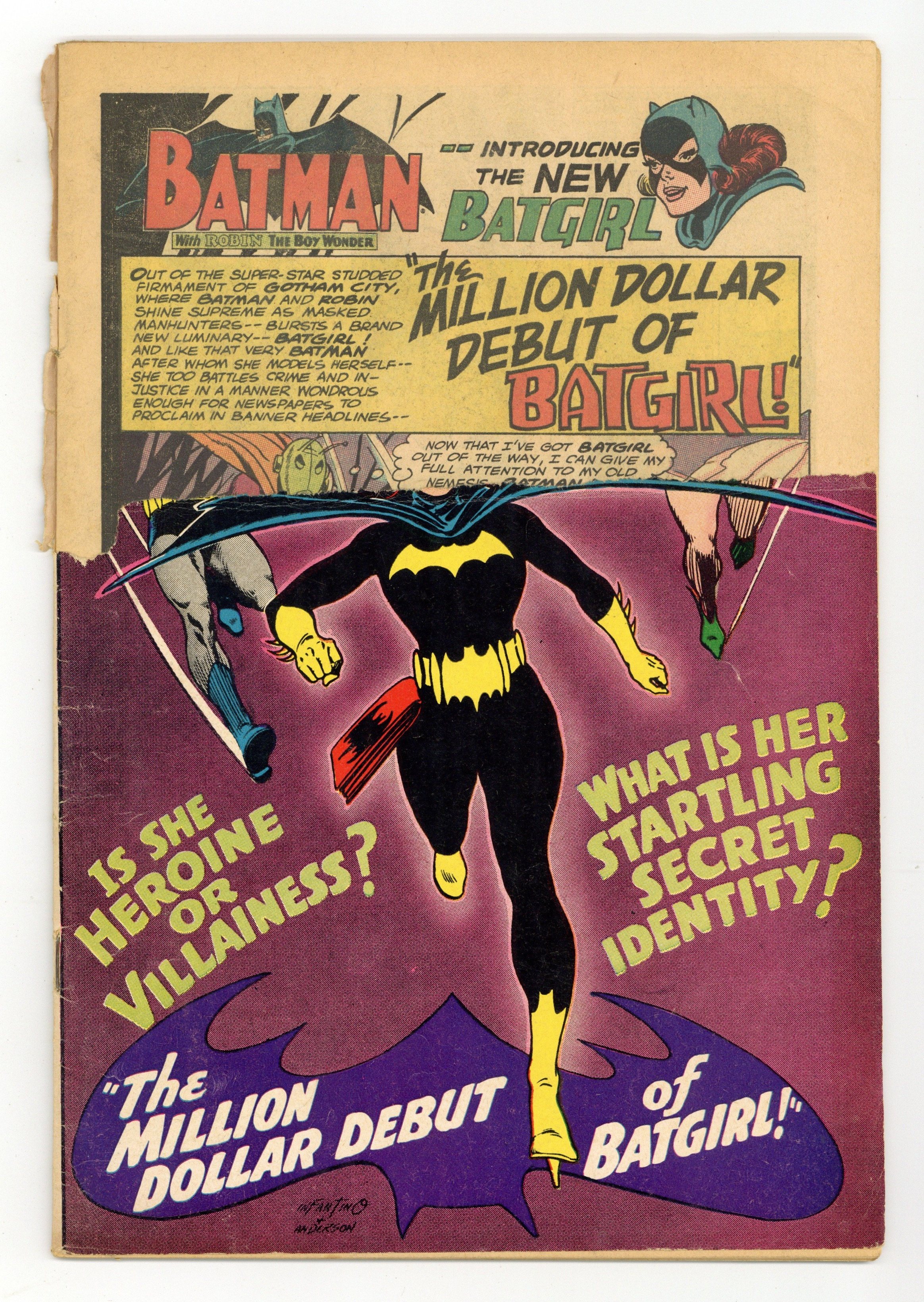 Written by Gardner Fox. Art by Carmine Infantino and Sid Greene. Cover by Carmine Infantino and Murphy Anderson. 1st appearance of the new Batgirl (Barbara Gordon) in The Million Dollar Debut of Batgirl!; Batgirl goes to a costume party dressed as Batgirl; she sees Killer Moth attack Bruce Wayne. Written by Gardner Fox. Art by Murphy Anderson. Riddle of the Sleepytime Taxi!; Ralph Elongated Man Dibny and Sue fall asleep in the back seat of a taxi while going to a costume party; Ralph discovers that crooks criminals are putting passengers to sleep to copy secret documents. Cap's Hobby Hints activity page by Henry Boltinoff. Letter to the editor from comics writer Mark Evanier. 36 pages, full color. $0.12. Cover price $0.12.