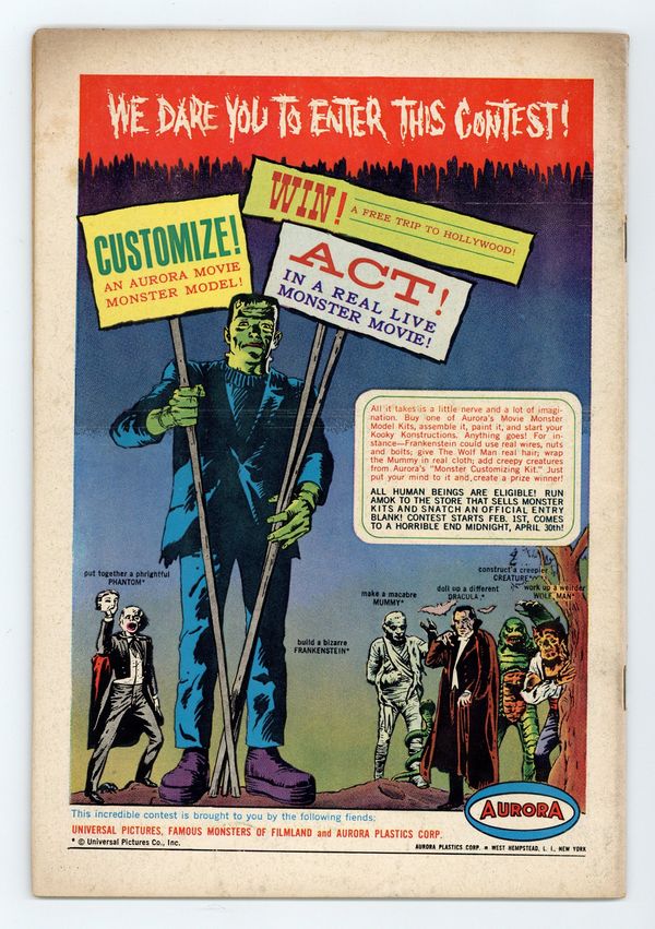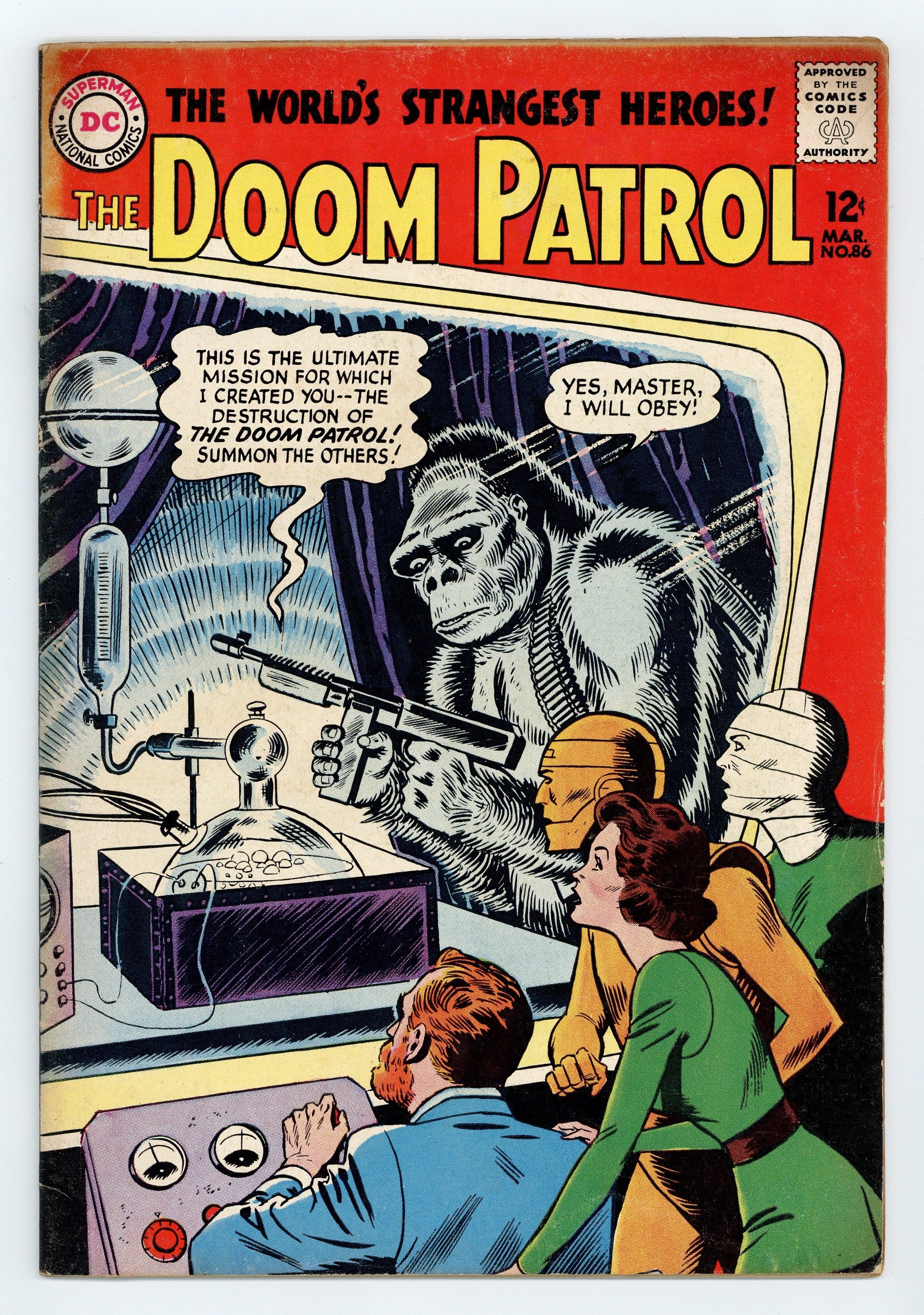 Cover art by Bob Brown. The Brotherhood of Evil (part 1), script by Arnold Drake, art by Bruno Premiani; The Doom Patrol create gifts for The Chief for his birthday. The Trail of the Terrible Titan (part 2), script by Arnold Drake, art by Bruno Premiani; Mr. Morden steals the giant robot Rog and attacks the Doom Patrol in an attempt to join the Brotherhood of Evil. A Medal for Go-Buggy 3!, script and art by Howard Purcell. 36 pgs. $0.12. Cover price $0.12.