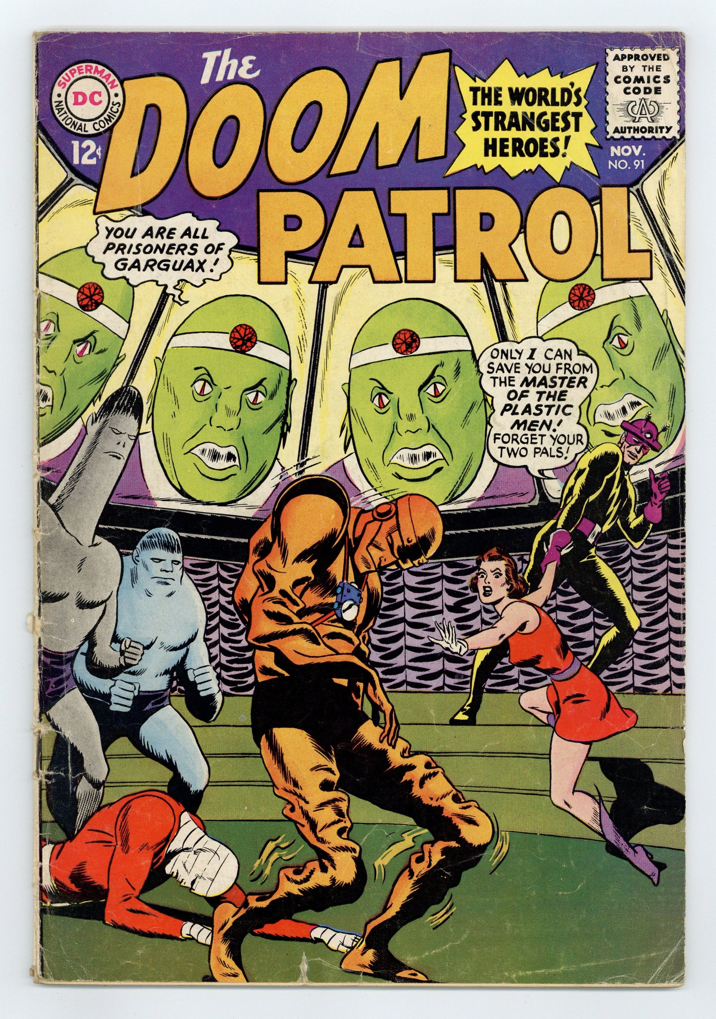 Cover by Bob Brown. Mento--the Man Who Split the Doom Patrol (part 1), script by Arnold Drake, art by Bruno Premiani; The Doom Patrol are called to a prison where a nitro-bomb has been placed to destroy the institution unless the prisoners demands are met; When the Doom Patrol tries to stop the bomb, they are stopped by a man named Mento, who uses his mental power enhancing helmet to dispose of the bomb; Mento expresses his intention to court Rita and tries convince her to leave the Doom Patrol and team up with him. Professor Eureka humor page by Henry Boltinoff. Terror of the Android Master (part 2). Willy and Dilly humor page by Henry Boltinoff. Fortress in the Stratosphere (part 3). Letter to the editor from comic artist Dave Cockrum. 36 pgs., full color. $0.12. Cover price $0.12.