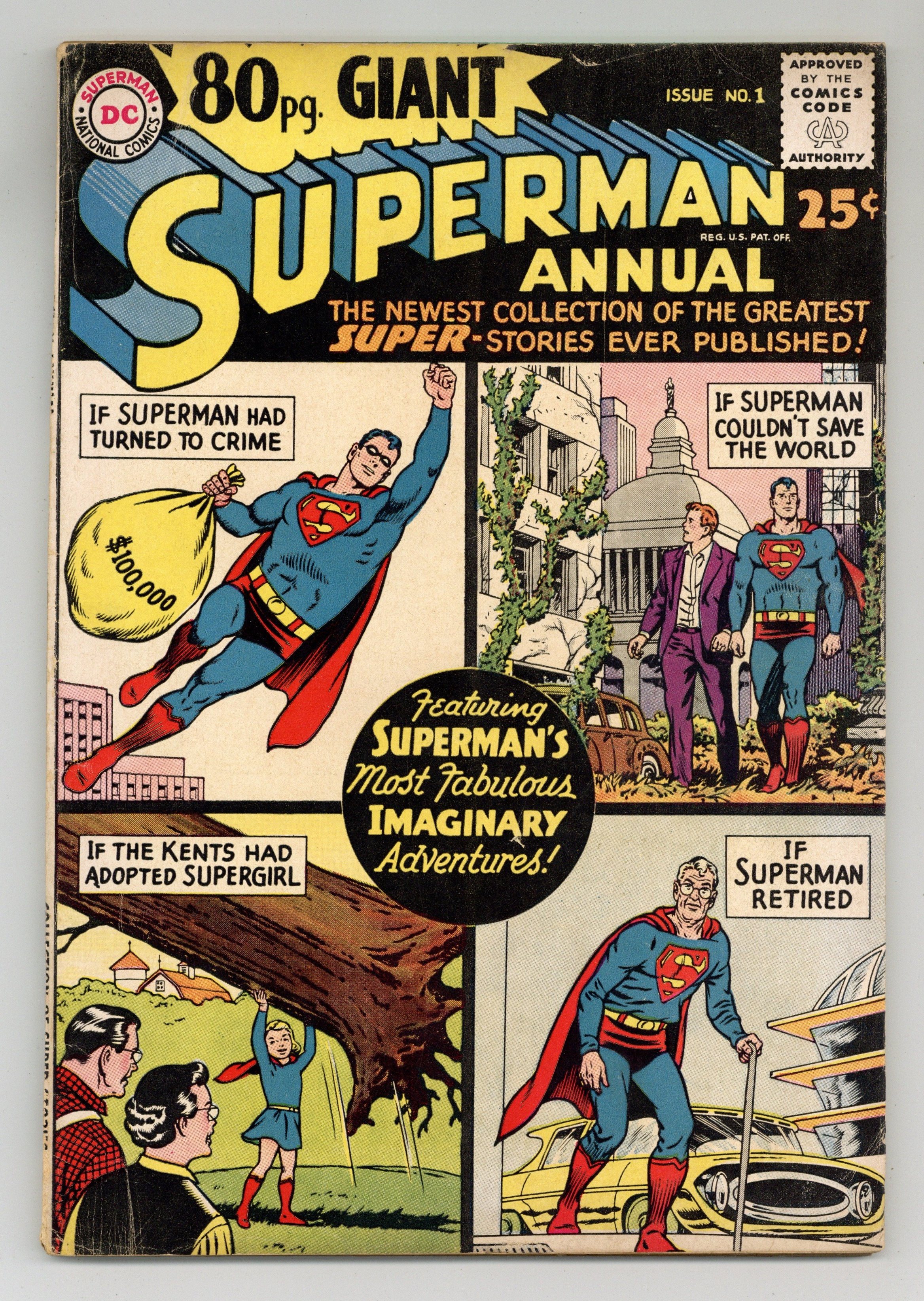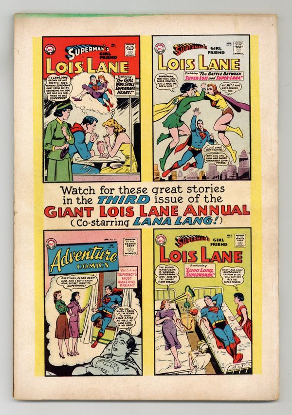 Superman Annual 80-Page Giant; imaginary adventures. All reprints. Cover pencils by Curt Swan, inks by George Klein. Giant Superman Annual ad. "The Revenge of Luthor!", script by Jerry Siegel, art by Al Plastino; Exposure to Red Kryptonite seemingly causes Superman and Superboy to exist simultaneously, Luthor takes advantage by trapping Superboy and forcing Superman to choose between Lois and Lana. "The Old Man of Metropolis!", script by Otto Binder, pencils by Curt Swan, inks by John Forte; Superman inadvertently smashes through the time barrier into the future--but emerges as an old man with no super powers. "Claire Kent, Alias Super-Sister!", script by Otto Binder, art by John Sikela; When Superboy saves a spacecraft from a crash landing, the pilot Shar-La, takes exception to his chauvinistic manner and transforms him into a girl. "The Superman Book That Couldn't Be Finished," script by Otto Binder, pencils by Curt Swan, inks by Ray Burnley; Jimmy is having difficulties finishing his first novel; Superman helps his pal by taking him into the future and bringing back a copy of the finished book. "Ma and Pa Kent Adopt Supergirl!", script by Jerry Siegel, art by Jim Mooney; In a story from before she became the Danvers' daughter, Linda dreams of being adopted by the Kents. "Chapter I: The Super-Brat from Krypton," script by Jerry Siegel, pencils by Curt Swan, inks by John Forte; A freak accident creates a duplicate of Kal-El's rocket including a double of its tiny passenger; On Earth, Kal's doppelganger is adopted by a crooked couple, the Dereks, and becomes Super-Brat. "Chapter 2 The Young Super-Bully," script by Jerry Siegel, pencils by Curt Swan, inks by John Forte; Now a teenager, Super-Bully tries to steal Clark's life but doesn't bargain for Krypto's super-sense of smell as the Dog of Steel is not fooled. "Chapter III Superman vs. Super-Menace!", script by Jerry Siegel, pencils by Curt Swan, inks by John Forte; Now grown to manhood and significantly, immune to Kryptonite, Super-Menace battles the Man of Steel, however on the verge of victory he learns the truth about himself and the evil Dereks. "The Superman Legend" article. Giant Lois Lane Annual #3 ad. 84 pgs., full color. Cover price $0.25.