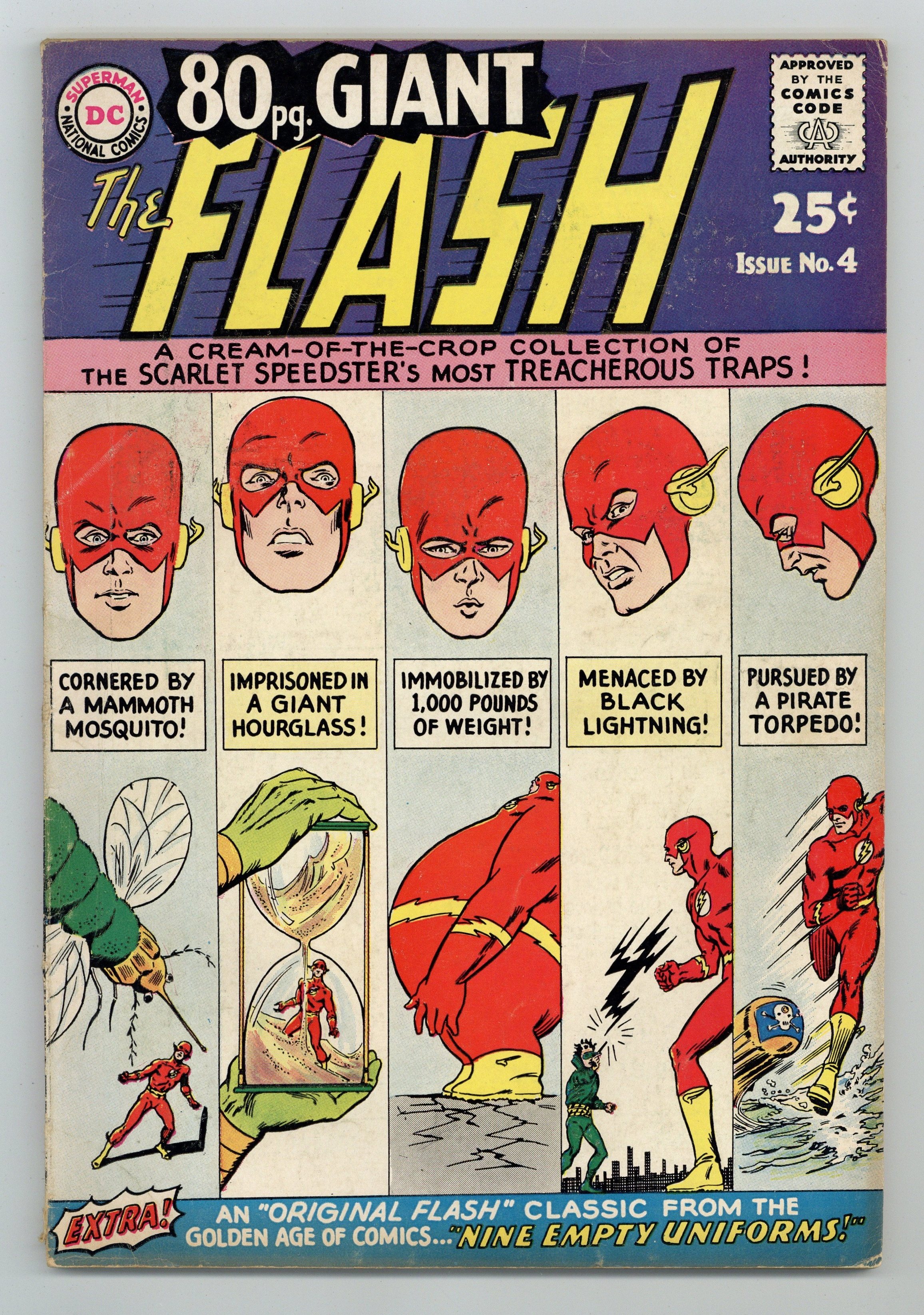 Flash reprints. Cover pencils by Carmine Infantino, inks by Murphy Anderson. "Around the World in 80 Minutes!", script by Robert Kanigher, pencils by Carmine Infantino, inks by Joe Giella; Police scientist Barry Allen invents a radio watch which picks up S.O.S. calls from many different countries, in order for him to avert these catastrophes, he must literally race around the world in eighty minutes. Ad for Green Lantern and Justice League of America. "Giants of the Time-World!", script by Robert Kanigher, pencils by Carmine Infantino, inks by Frank Giacoia; When Iris West disappears while on an assignment, The Flash follows her into another dimension. "The Master of Mirrors," script by John Broome, pencils by Carmine Infantino, inks by Joe Giella; Scudder, a small time criminal, discovers he can solidify images from his trick mirrors, he then uses this knowledge to commit crimes as The Mirror Master. "Nine Empty Uniforms!", script by Robert Kanigher, pencils by Carmine Infantino, inks by Frank Giacoia; Jay Garrick and The Flash help aging baseball team, The Bobtails, regain their confidence. Flash's Rogues' Gallery illustration, pencils by Carmine Infantino, inks by Murphy Anderson. "The Challenge of the Weather Wizard!", script by John Broome, pencils by Carmine Infantino, inks by Murphy Anderson; Escaped criminal Mark Mardon reaches his brother Clyde's house to lie low, however, on entering finds his brother dead. Detective Comics/Batman ad. "The Day Flash Weighed 1000 Pounds!", script by John Broome, pencils by Carmine Infantino, inks by Joe Giella; Grodd, the Super-Gorilla has seemingly died in Gorilla City, in reality he has found a way to take over the mind of a human being (William Dawson); As Dawson, he invents a gun which causes The Flash to absorb vast amounts of moisture from the air, bulking him up to 1000 pounds in weight. The Flash ad. Pinup of Barry ("Flash") Allen, Jay ("Flash") Garrick, and Wally ("Kid Flash") West, pencils by Carmine Infantino, inks by Murphy Anderson. 84 pgs., full color. Cover price $0.25.