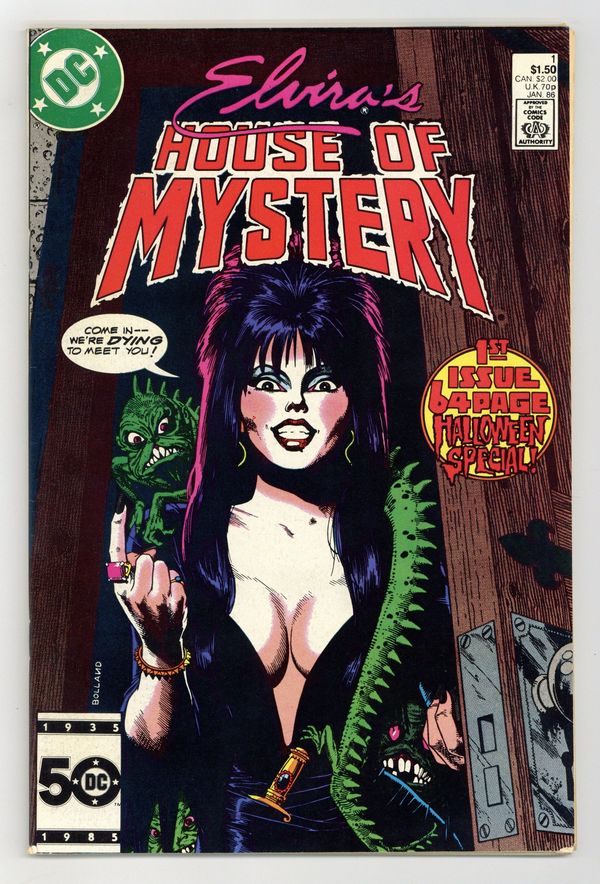 Direct Edition. 64-page Halloween Special. Cover art by Brian Bolland. Elvira inside front cover illustration by David Goldner. "Elvira's Quest," script by Joey Cavalieri, pencils by Ron Wagner, inks by Bob Oksner; The House of Mystery sends Elvira on a quest to find Cain. "The Realm," script by Philip Clarke, Jr., pencils by Tom Grindberg, inks by Irwin Hasen. "Death Likes a Lullaby," script by Robert Kanigher, art by Arthur Geroche. "Once Upon a Time," script by Dennis Yee, pencils by Dennis Yee, inks by Jim Fern, Dan Adkins, and Tex Blaisdell. "Vengeance in the Creature Feature!", script by Jack C. Harris, art by Dan Spiegle. "The Witch's Cauldron," script and art by Ma's Fay; A witch conjures up demons and a little boy conjures up Superman and Batman. Back cover and inside back cover photographs of Elvira. 68 pgs., full color. Cover price $1.50.
